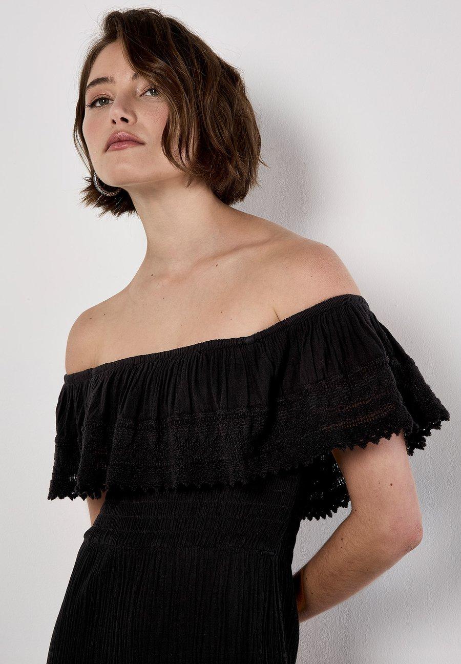 Это легкое и тканое летнее платье имеет невероятно привлекательную длину макси. Платье с вырезом Бардо украшено ярусами с кружевной оборкой и присборенным лифом для комфортной и одновременно подчеркивающей фигуру посадки. Вырез: С открытыми плечамиМатериал и уход