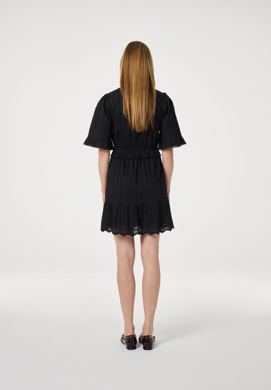 Это короткое черное платье из 100% хлопка отличается изящными, игривыми деталями и застежкой на пуговицы спереди. Легкое и воздушное, оно идеально подходит для летней вечеринки. Сочетайте с туфлями на каблуках для создания непринужденно элегантного летнего образа. Вырез: КруглыйМатериал и уход