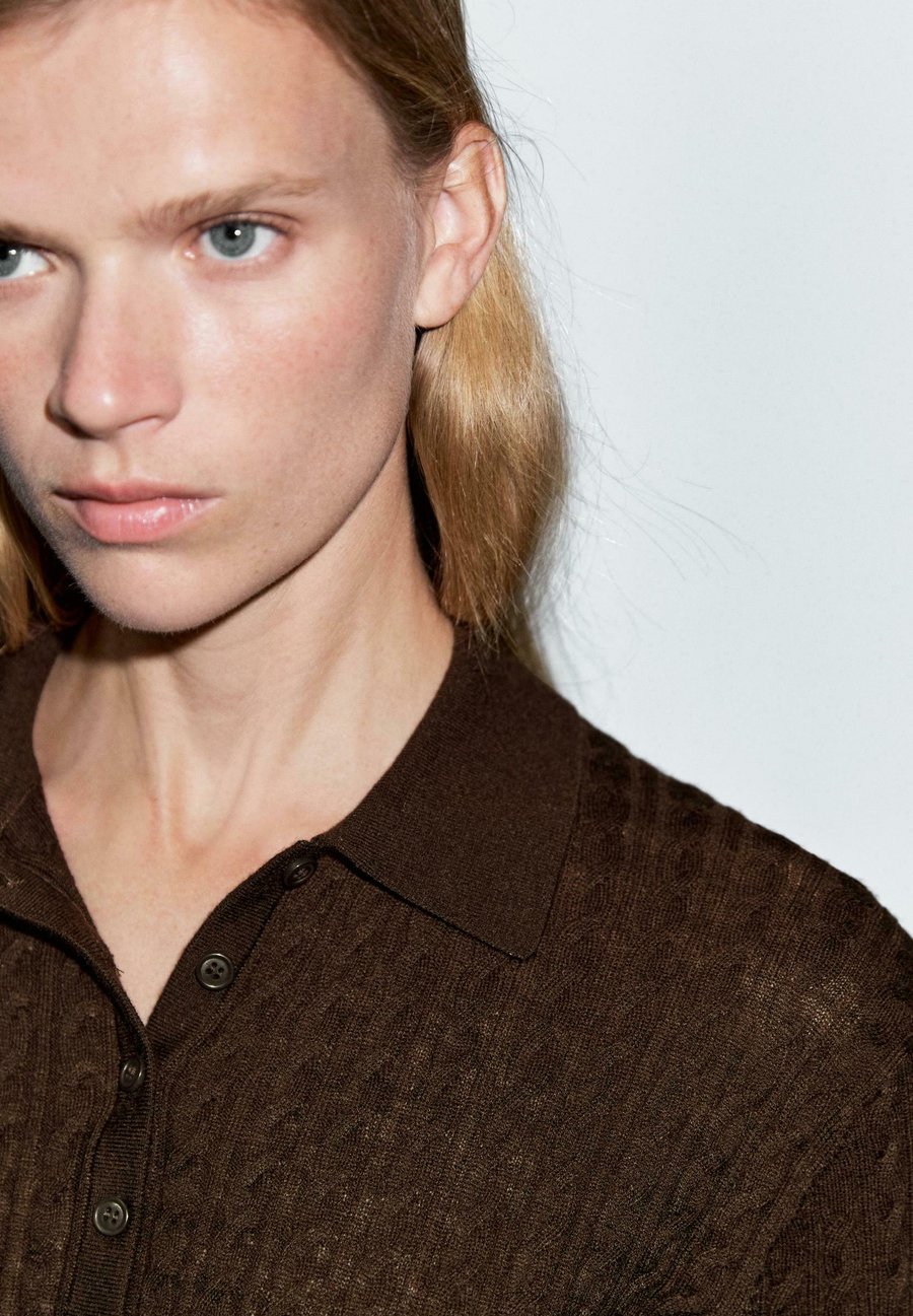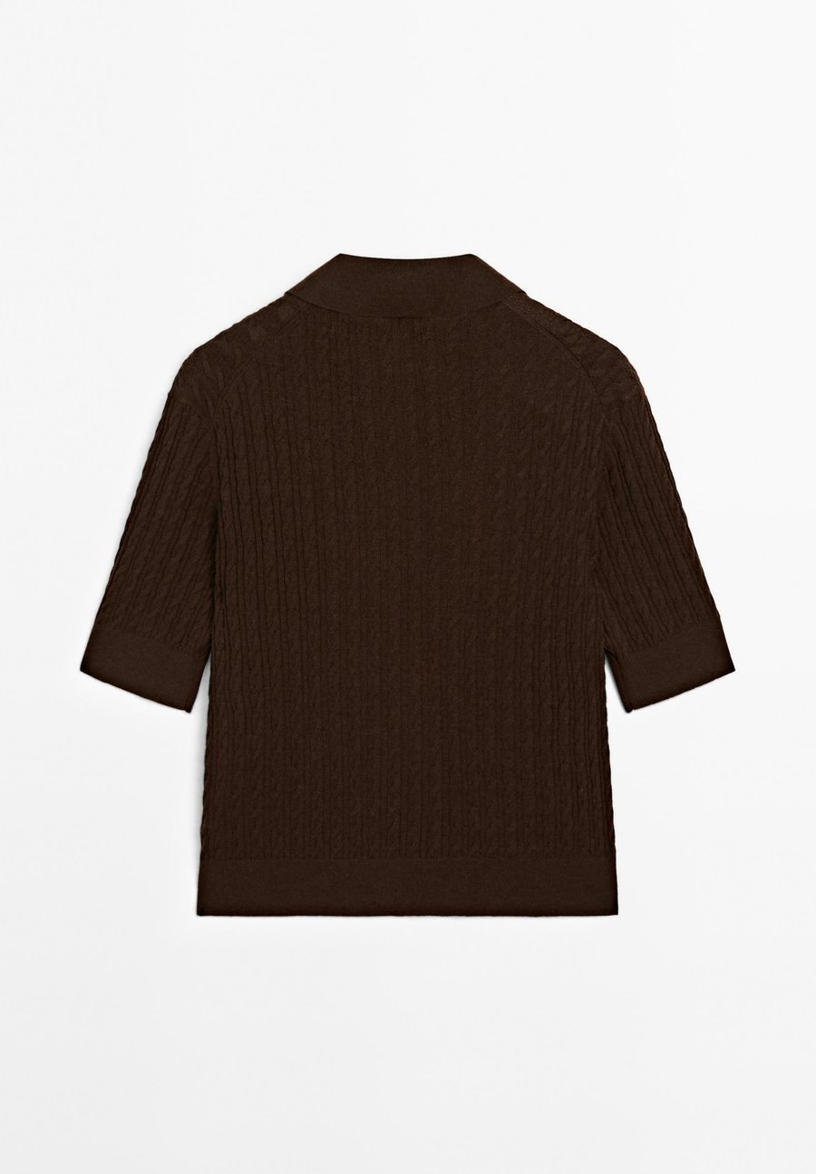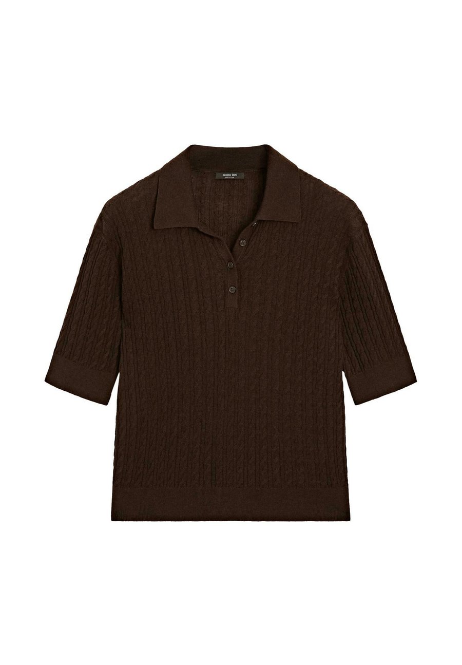 Рубашка-поло из трикотажной шерстяной смеси. Тонкая, легкая ткань. Рукава до локтя. Воротник на пуговицах. Детали с плетением. Воротник: рубашка полоМатериал и уход
