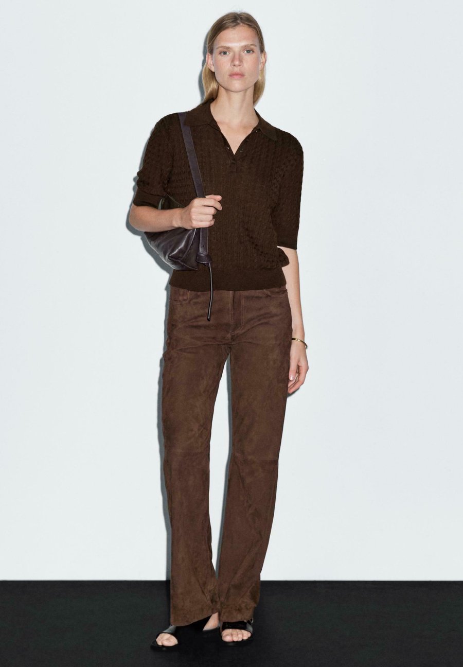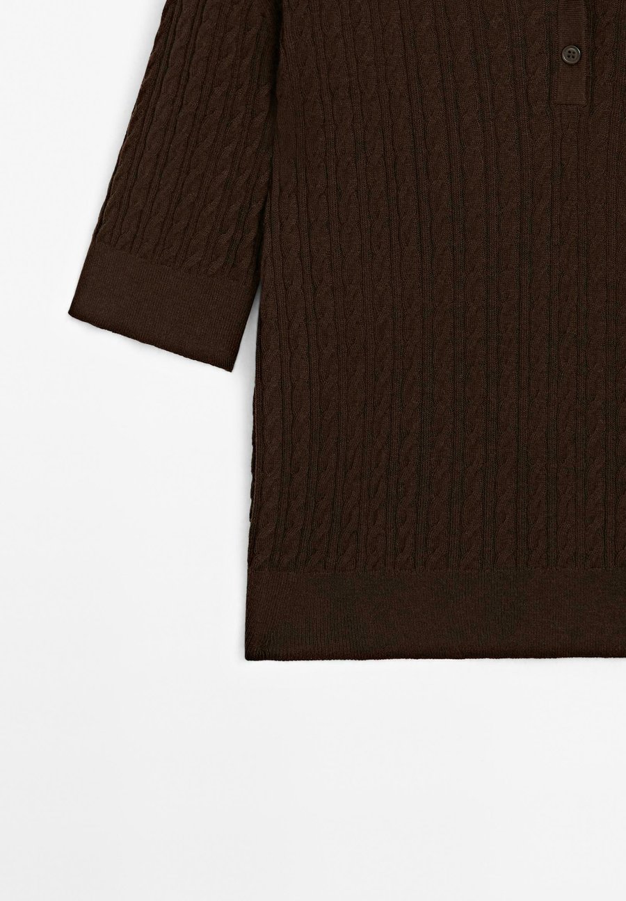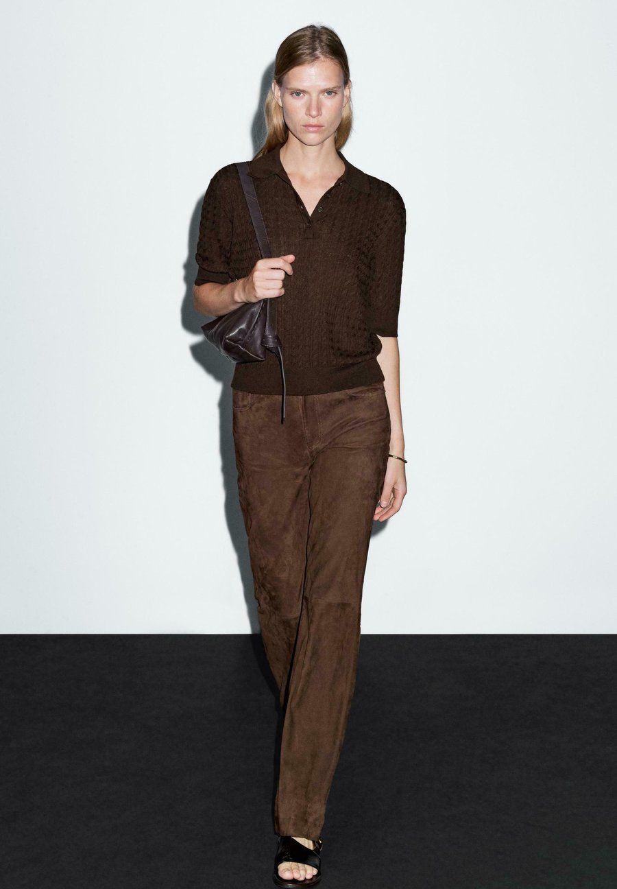 Рубашка-поло из трикотажной шерстяной смеси. Тонкая, легкая ткань. Рукава до локтя. Воротник на пуговицах. Детали с плетением. Воротник: рубашка полоМатериал и уход