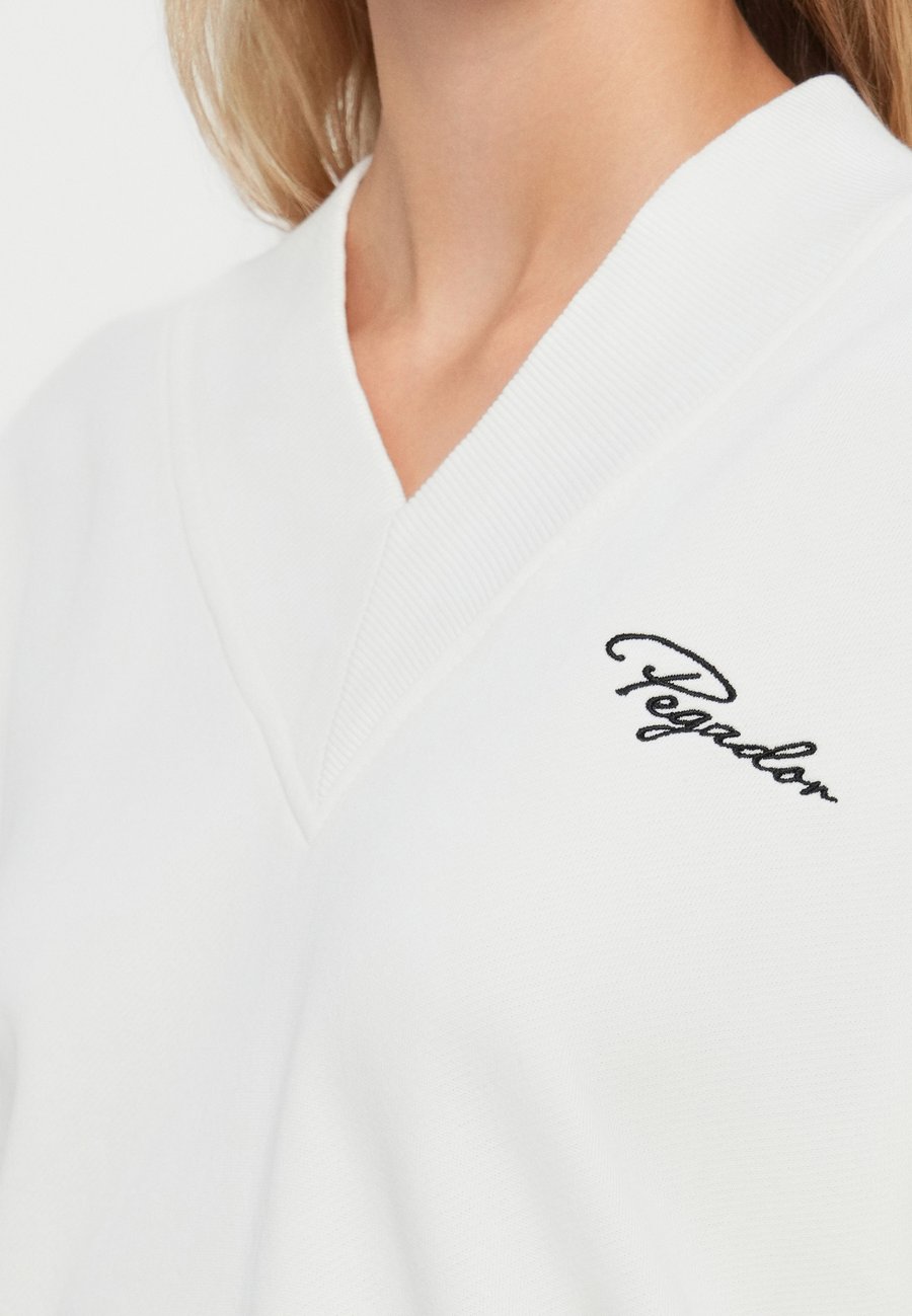 Мягкая внутренняя отделка. Небольшая этикетка-флажок на уровне груди. Вырез: V-образный.Материал и уход