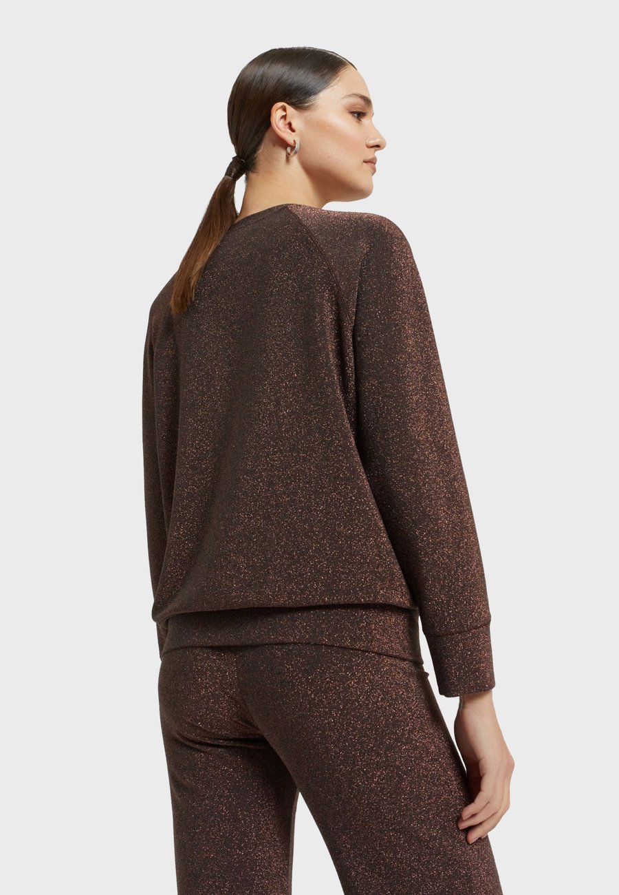 Свитшот с длинными рукавами, изготовленный в Италии, с металлизированным эффектом. Его мягкая, слегка блестящая текстура придает изысканность этой повседневной вещи. Прямой, удобный крой с ребристой отделкой на воротнике, манжетах и подоле. Стильная базовая вещь, которую можно носить с подходящими или разными брюками для создания современного и яркого образа. Вырез: КруглыйМатериал и уход
