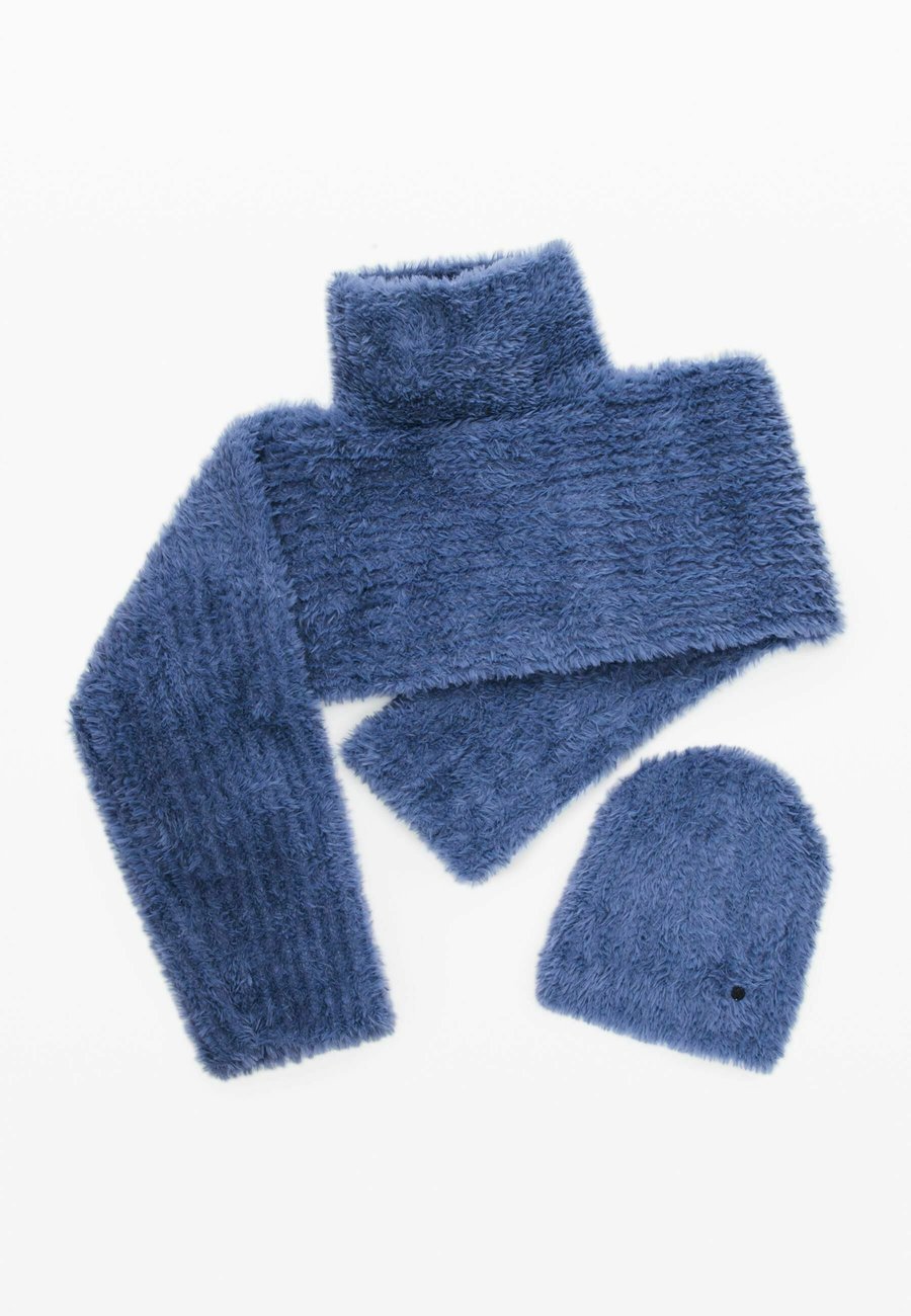 Комплект включает шапку и укороченный трикотажный свитер из полиэстера с высоким воротником и длинными рукавами. Короткий и плотный крой из мягкой вязки. Крой: укороченный. Трикотаж из полиэстера. Высокий воротник. Длинные рукава. Длина: короткая. Комплект шапки и свитера. Воротник: воротник-поло.