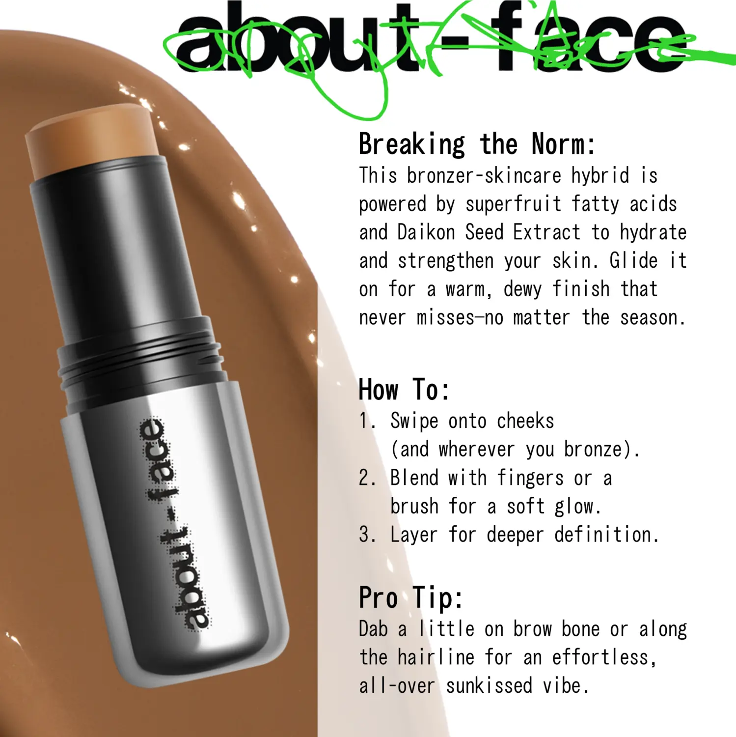 1. Используя стик, нарисуйте небольшие линии на обеих щеках и в других местах, куда вы наносите бронзер.Ингредиенты
