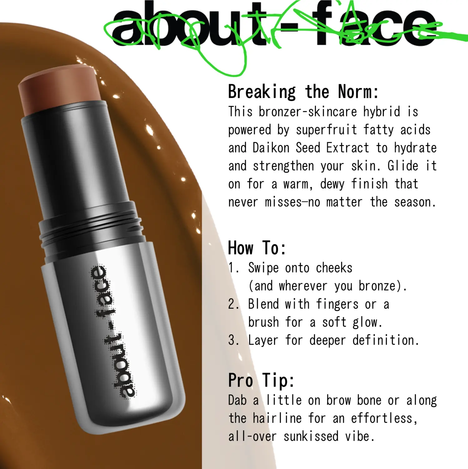 - РАЗРУШАЯ НОРМЫ: Этот высококачественный гибридный стик-бронзер и средство по уходу за кожей богат жирными кислотами, полученными из суперфруктов, и экстрактом семян дайкона, которые повышают увлажнение и укрепляют защитный барьер кожи.