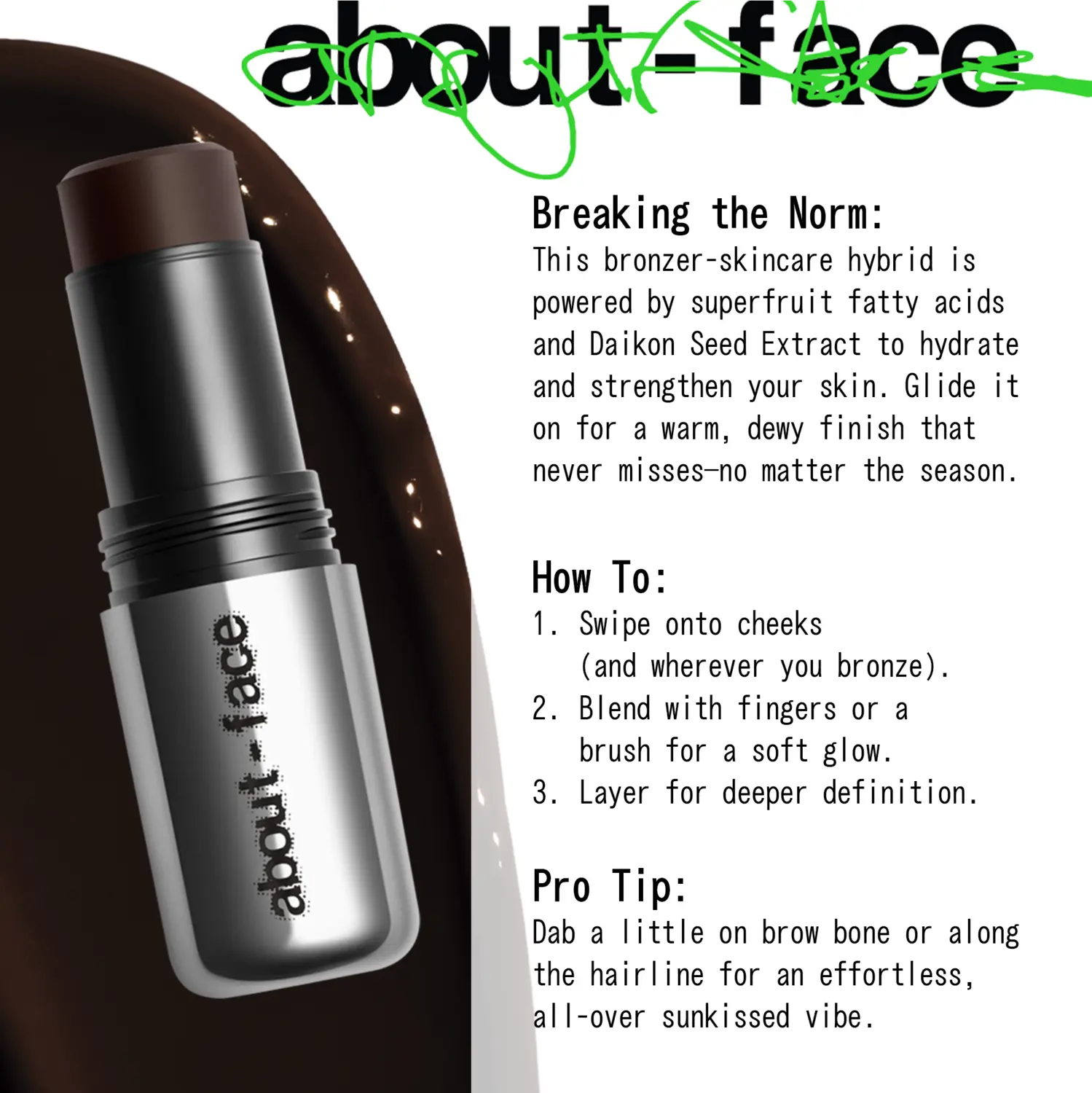 1. Используя стик, нарисуйте небольшие линии на обеих щеках и в других местах, куда вы наносите бронзер.Ингредиенты