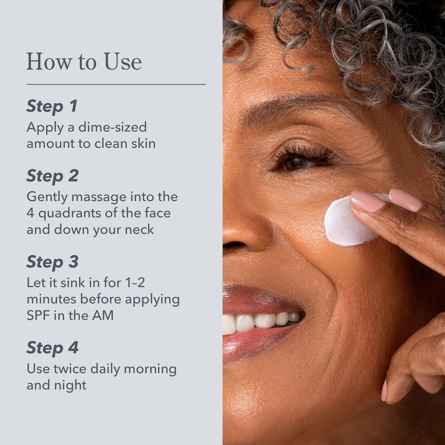 Нанесите небольшое количество (размером с горошину) на чистую кожу. Мягко помассируйте четыре участка лица и шею до полного впитывания. Для достижения наилучших результатов используйте два раза в день, утром и вечером после очищения. Днем используйте солнцезащитный крем.Ингредиенты
