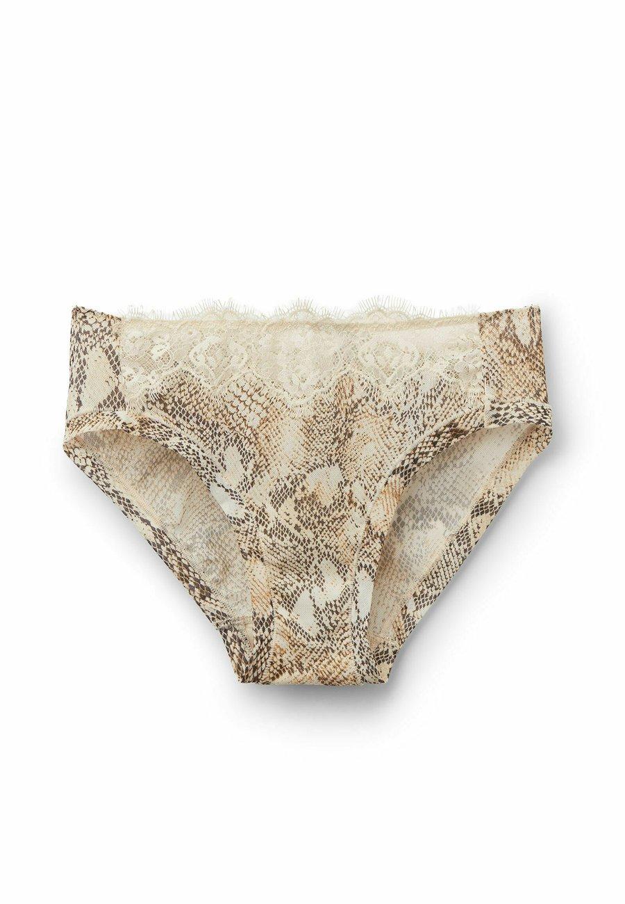 Мягкие тюлевые трусики с принтом под змеиную кожу, украшенные элегантной кружевной оборкой. Края сзади с плоскими швами обеспечивают мягкое прилегание к телу, не оставляя следов. Деталь: ПрозрачныеМатериал и уход