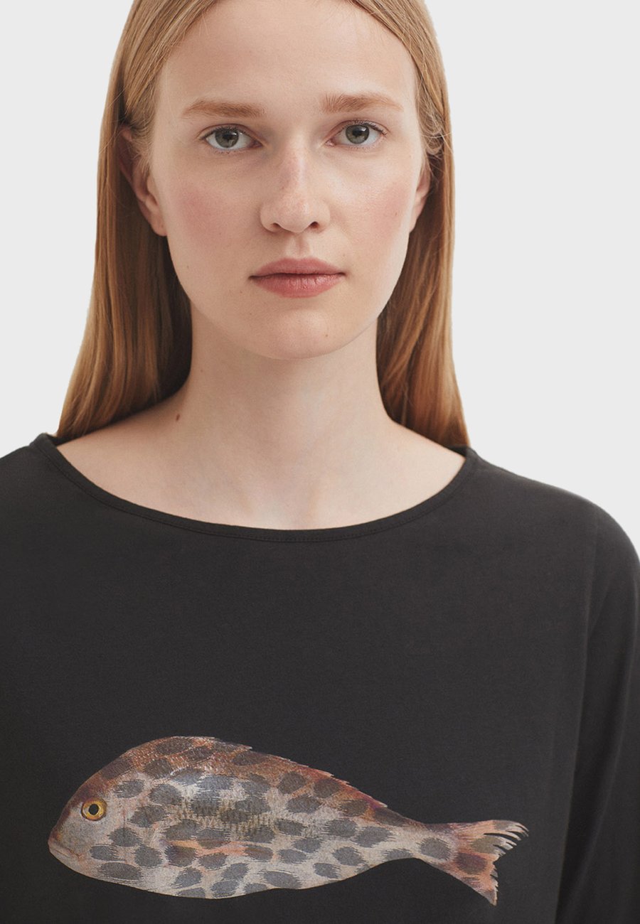 Мягкая футболка из органического хлопкового трикотажа со слегка приталенным прямым кроем. Вырез-лодочка. Эксклюзивный и художественный принт в виде рыб в стиле акварели по центру. Декоративная строчка в тон. Базовая модель с уникальной изюминкой. Сделано в Португалии. Вырез горловины: ЛодочкаМатериал и уход