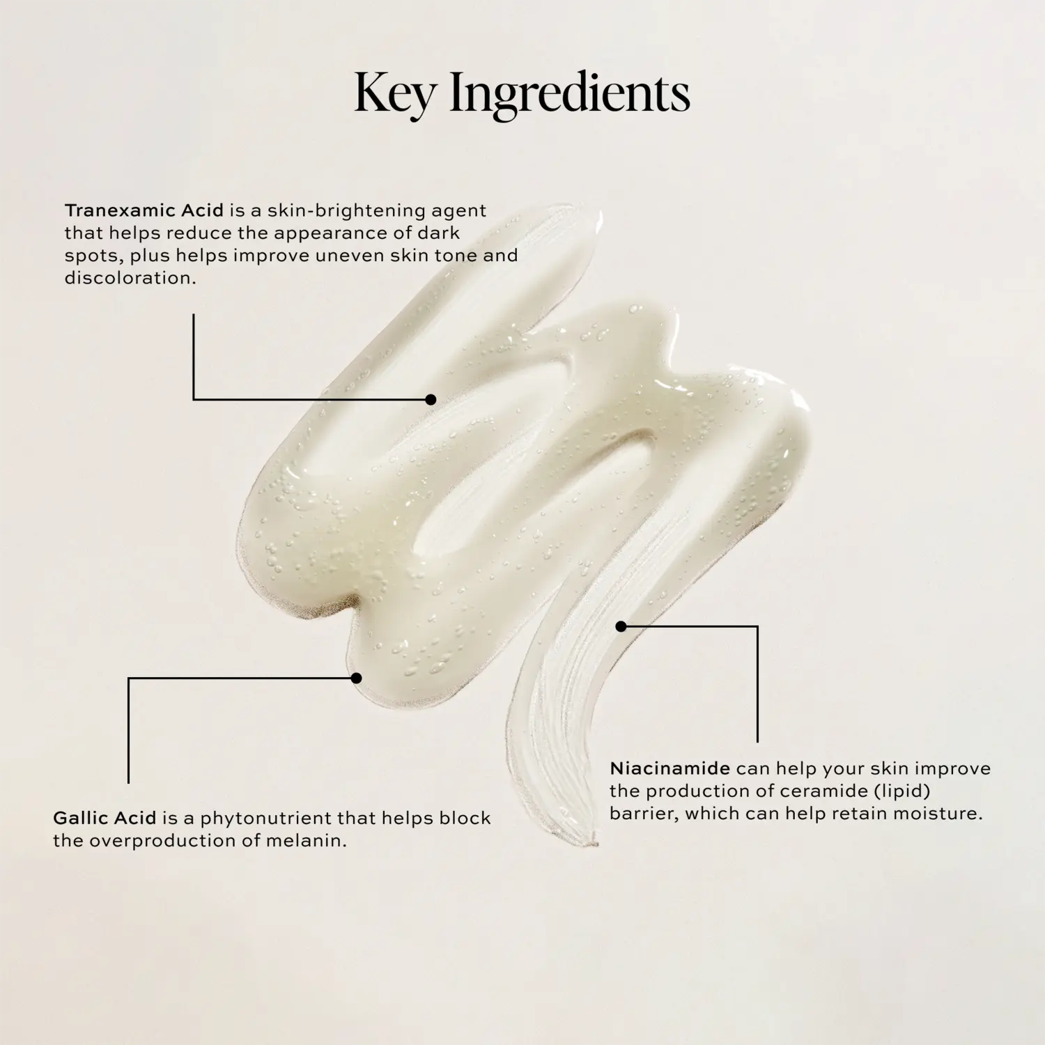 Water, Glycerin, Niacinamide, Bellis Perennis (Daisy) Flower Extract, Pentylene Glycol, Tranexamic Acid, Lactococcus Ferment Lysate, 1,2-Hexanediol, Squalane, Sodium Polyacryloyldimethyl Taurate, Xanthan Gum, Hydroxyacetophenone, Dimethicone, Sclerotium Gum, Lecithin, Pullulan, Pyrus Malus (Apple) Fruit Extract, Tetrasodium Glutamate Diacetate, Diglucosyl Gallic Acid, Silica, Aloe Barbardensis Leaf Juice, Dunaleilla Salina Extract.