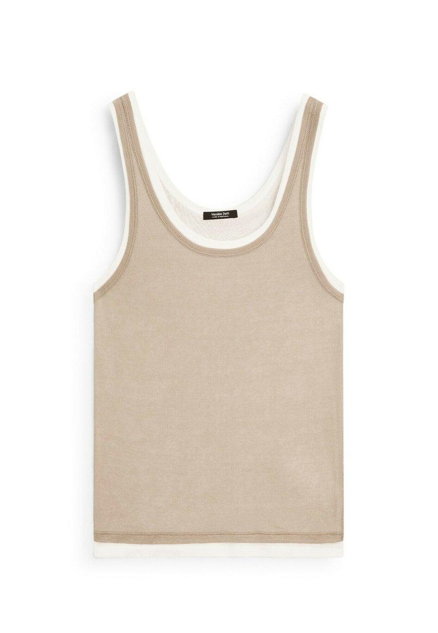 Футболка на бретелях. Круглый вырез. Изготовлена из 100% хлопка. Эффект потертости для легкого эффекта носки. Детали контрастного цвета. Изделие состоит из двух частей, соединенных небольшим швом по верхнему краю. Вырез горловины: Круглый.Материал и уход
