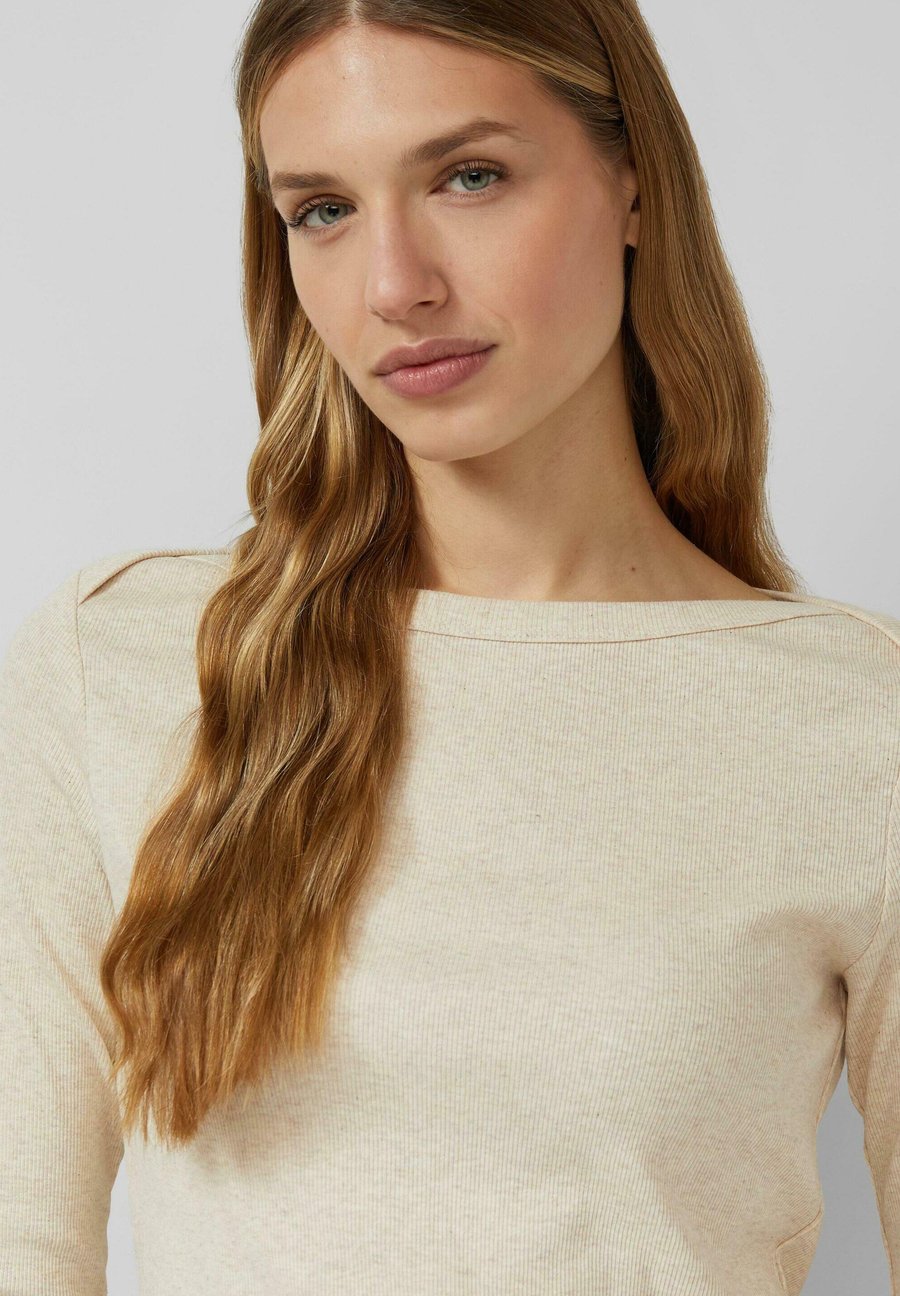 Откройте для себя мягкую ребристую рубашку с длинными рукавами в классическом дизайне. Женственный вырез-лодочка и эластичный трикотаж меланжевого цвета делают ее идеальным спутником. Вырез: ЛодочкаМатериал и уход