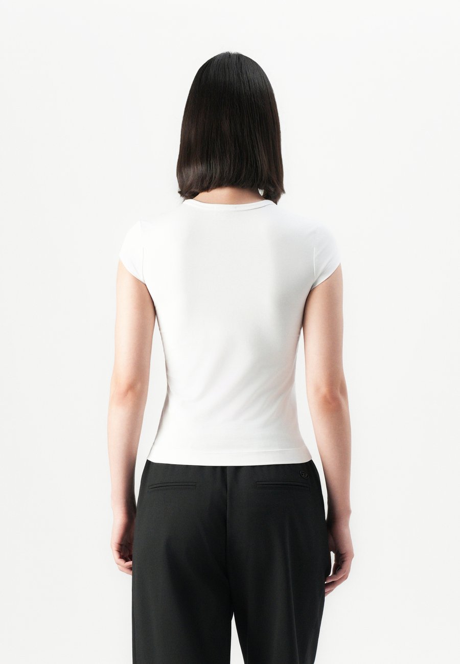 Небольшая этикетка-флажок на уровне груди. Вырез горловины: круглый.Материал и уход