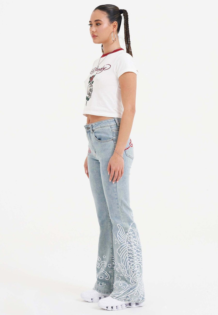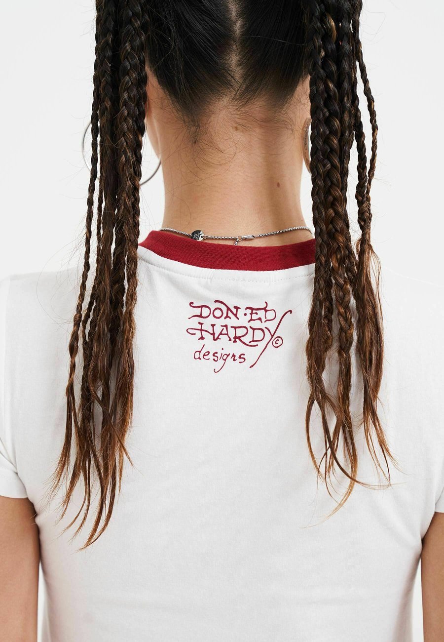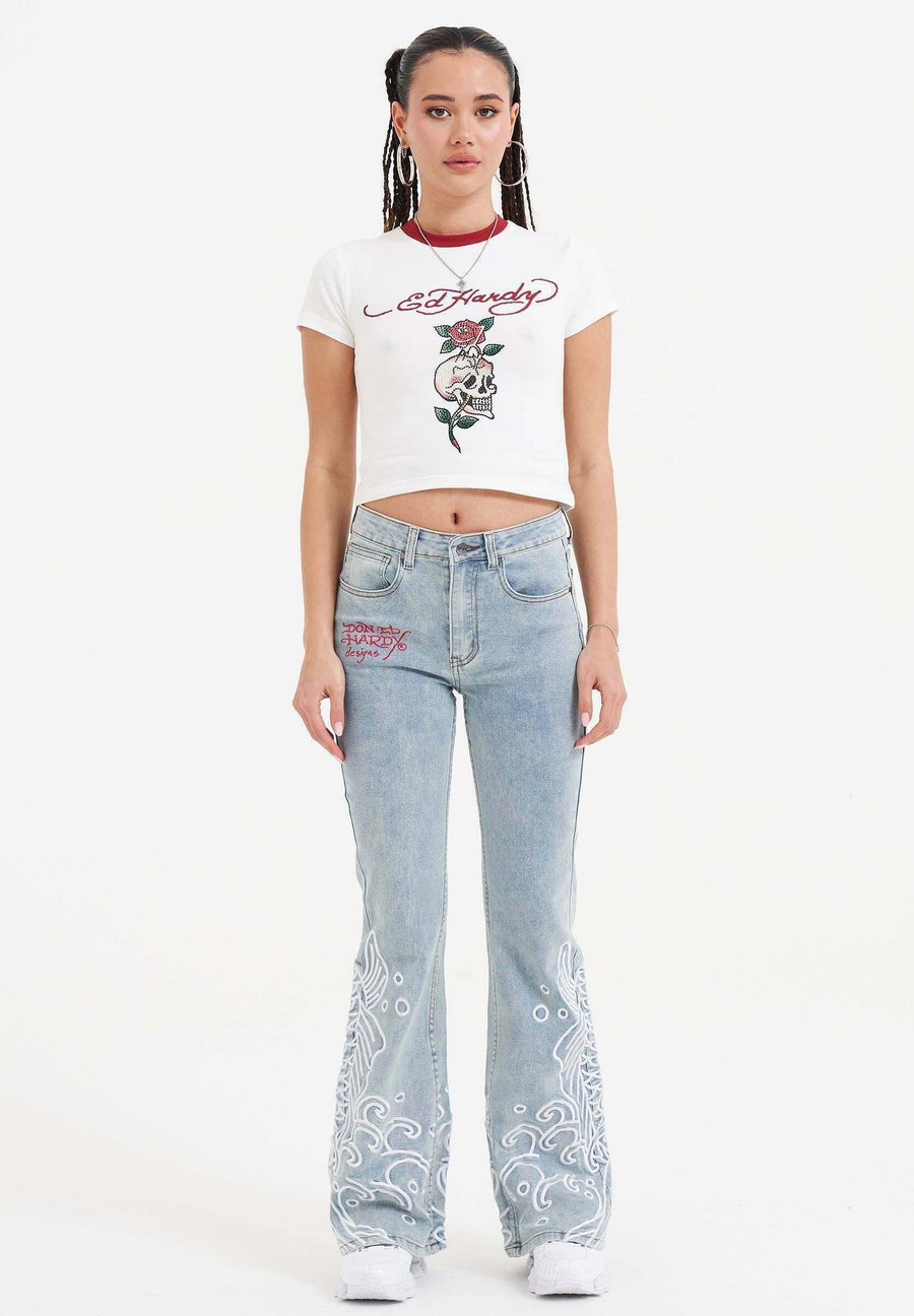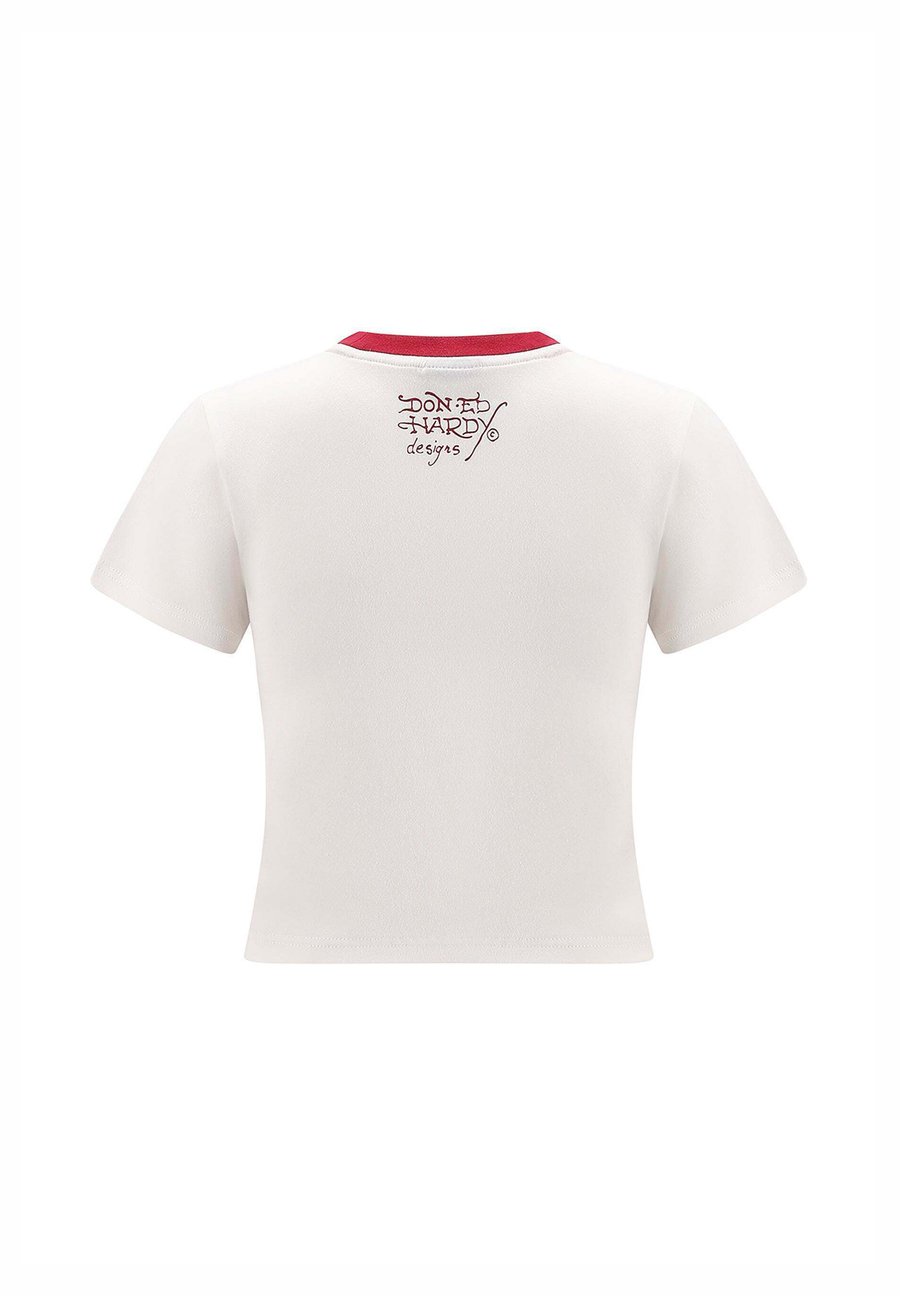 Футболка для малышей с изображением черепа, розы и страз. Приталенный крой. Графический рисунок в виде черепа с розой и стразами. Контрастный воротник. Белая детская футболка. 95% хлопок, 5% спандекс. Вырез горловины: круглый.Материал и уход