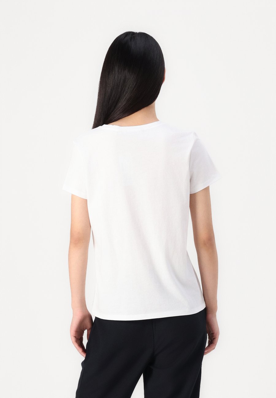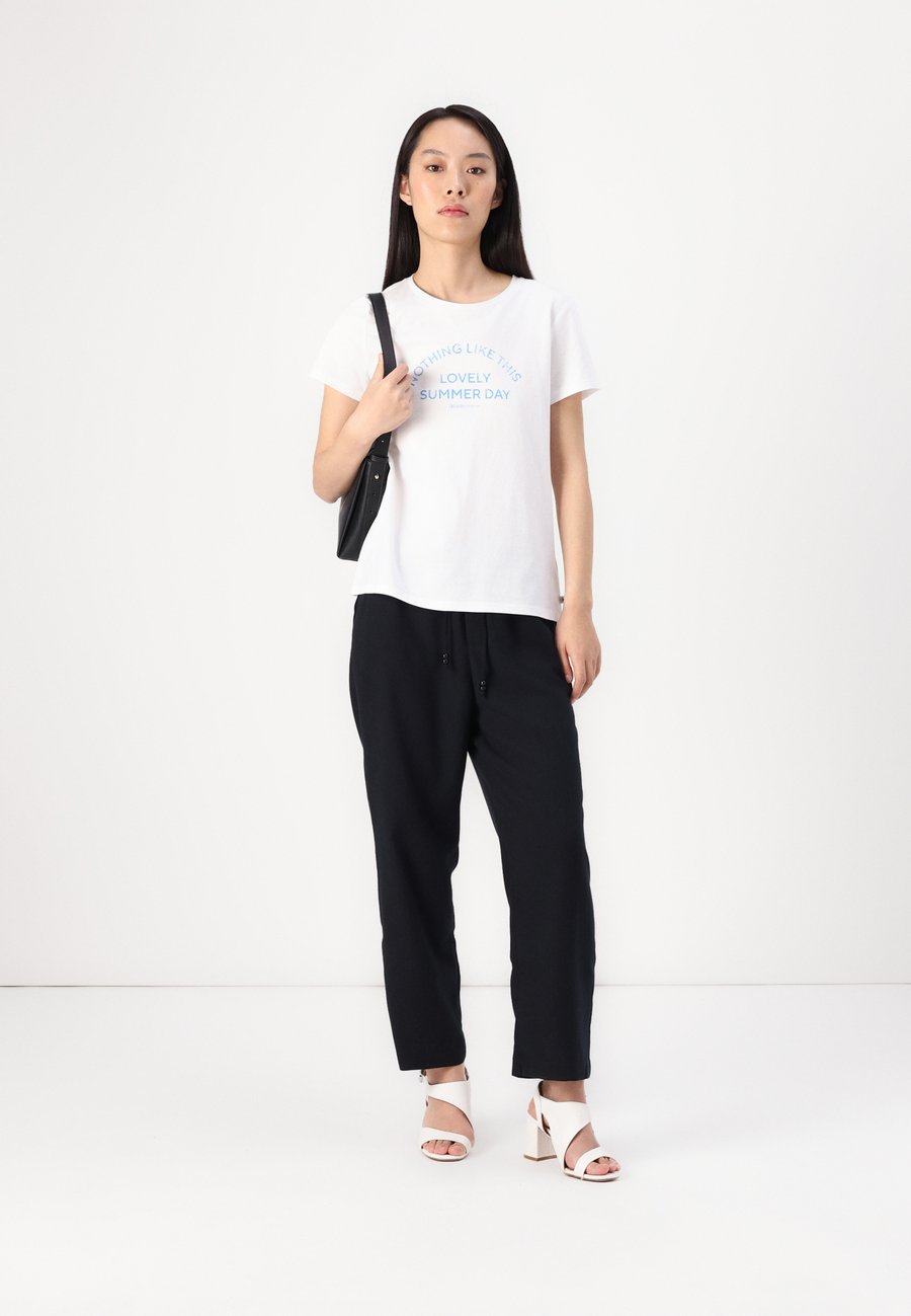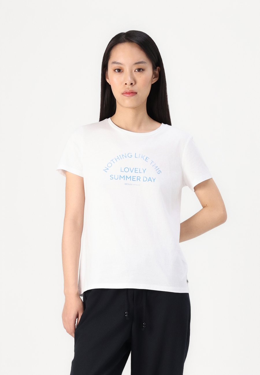 Футболка с текстовым принтом на груди. Изготовлена из однослойного трикотажа из хлопка. Вырез горловины: круглый.Материал и уход