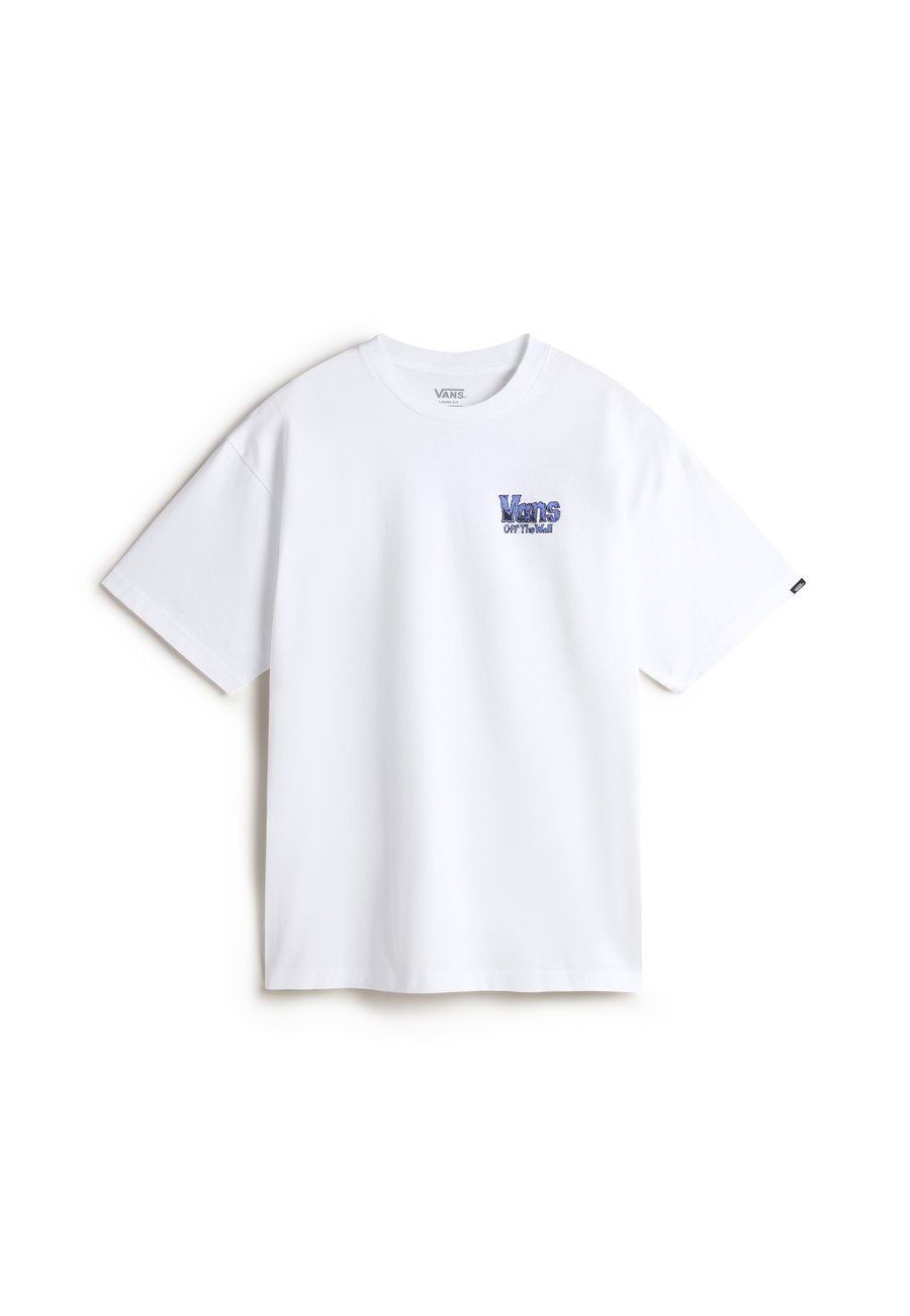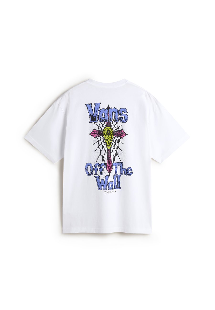 Футболка Z Legacy свободного кроя - Мужская футболка. Цвет и состав материала: - Чистая белая основа с графическим принтом синего, розового и желтого цветов - 100% хлопок. Особенности посадки и комфорта: - Свободный силуэт для свободы движений - Классический круглый вырез с ребристым воротником - Короткие рукава с аккуратно обработанными манжетами - Стандартная длина до бедра - Мягкая, дышащая хлопковая ткань для комфорта в течение всего дня. Эта футболка Legacy сочетает в себе классический стиль Vans с современным уличным стилем. Яркий графический принт на спине с культовым слоганом "Off The Wall" и деталями в виде паутины и черепа создает смелый образ, а свободный крой и высококачественный хлопок обеспечивают максимальный комфорт при повседневной ношении. Эта футболка - воплощение аутентичной ДНК Vans с современным акцентом, будь то катание на скейтборде или встреча с друзьями. Вырез горловины: круглый.Материал и уход