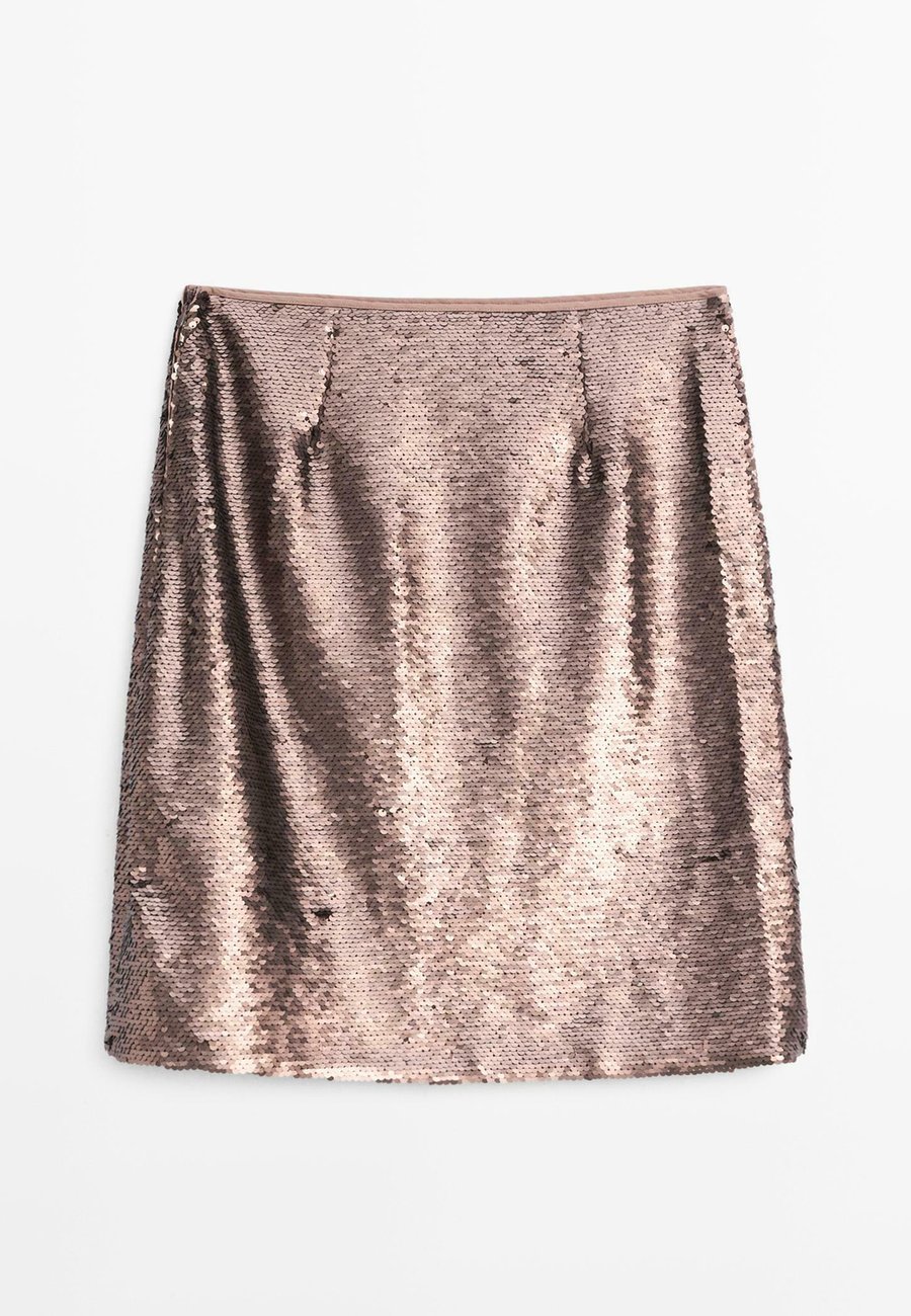 Застежка на боковую молнию. Короткая юбка из ткани с матовыми пайетками. На подкладке. Застежка: МолнияМатериал и уход