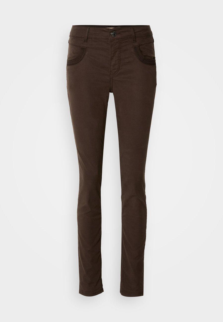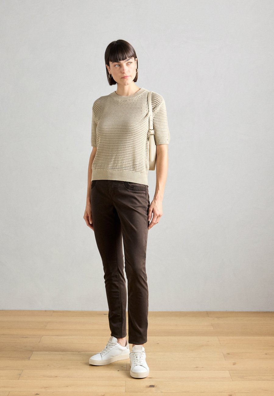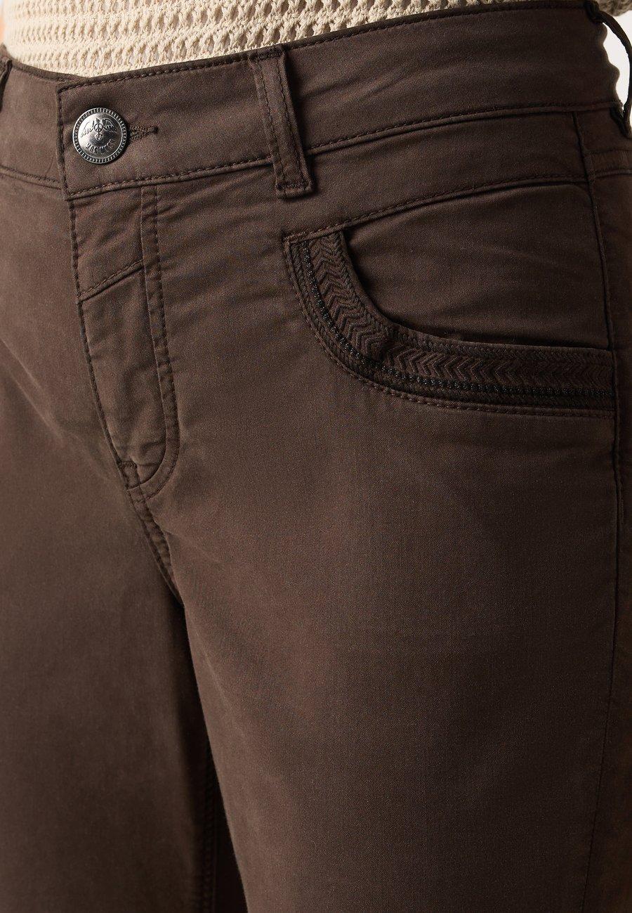 Пятикарманный фасон. Нашивка из натуральной кожи на поясе. Высота посадки: высокая.Материал и уход