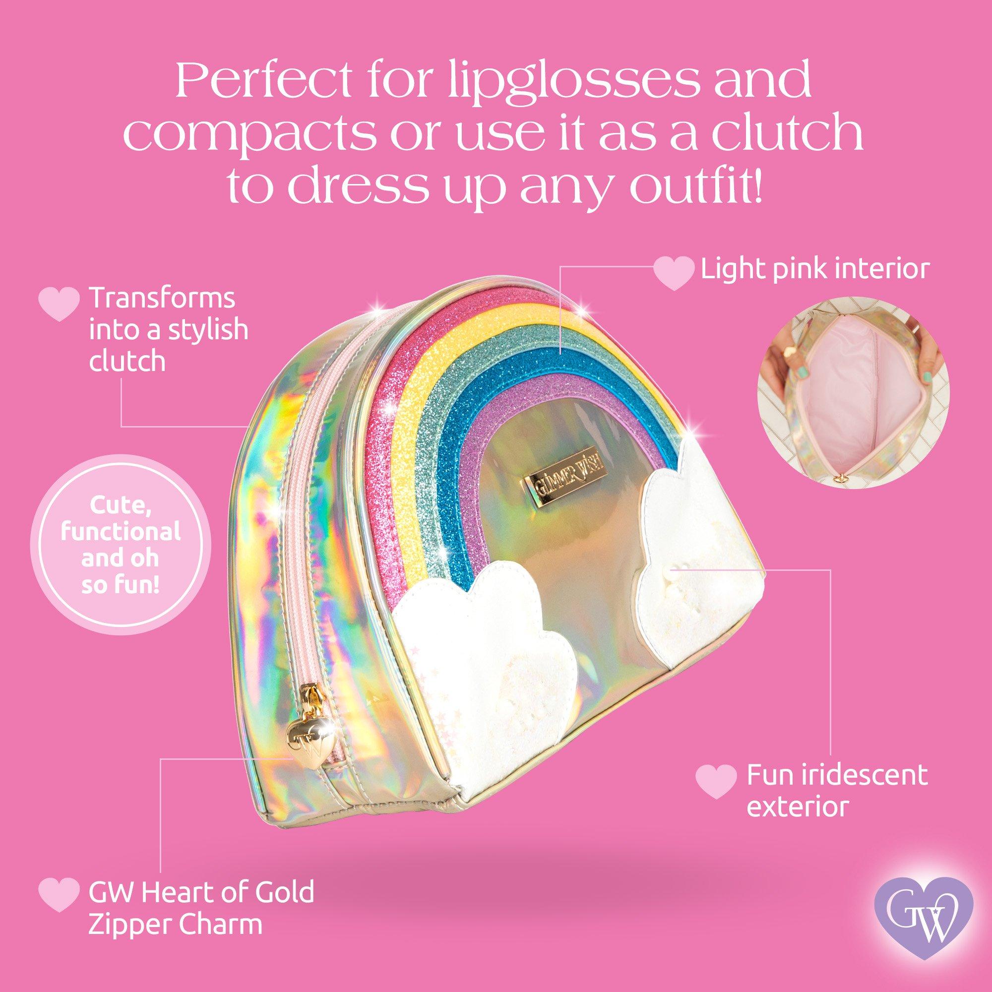- Очаровательная косметичка в виде радуги - Организуйте и храните все необходимые косметические средства в безопасности и готовыми к поездкам и путешествиям! Вам понравится эта косметичка, и вы получите множество комплиментов за ее милый внешний вид с подвеской в виде золотого сердечка на молнии и забавным переливающимся покрытием - вы будете готовы ко всему!