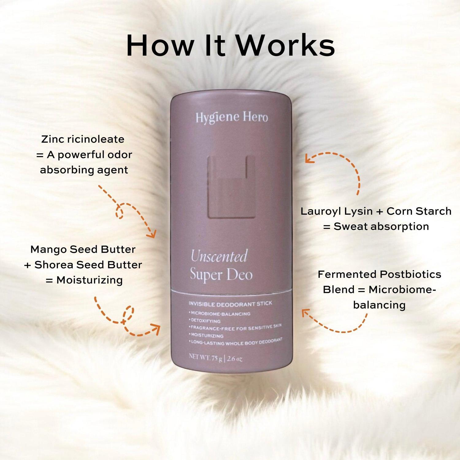 Нанесите 2-3 движения на чистую сухую кожу для длительной свежести. Используйте на подмышках, интимных зонах, внутренней поверхности бедер, стопах, складках живота, под грудью, запястьях или в любом другом месте, где необходим контроль запаха. Дезодорант Super Deo также можно использовать как твердый ароматизированный бальзам - благодаря увлажняющей формуле и гладкой текстуре - просто нанесите на запястья или за уши для естественного аромата.Ингредиенты