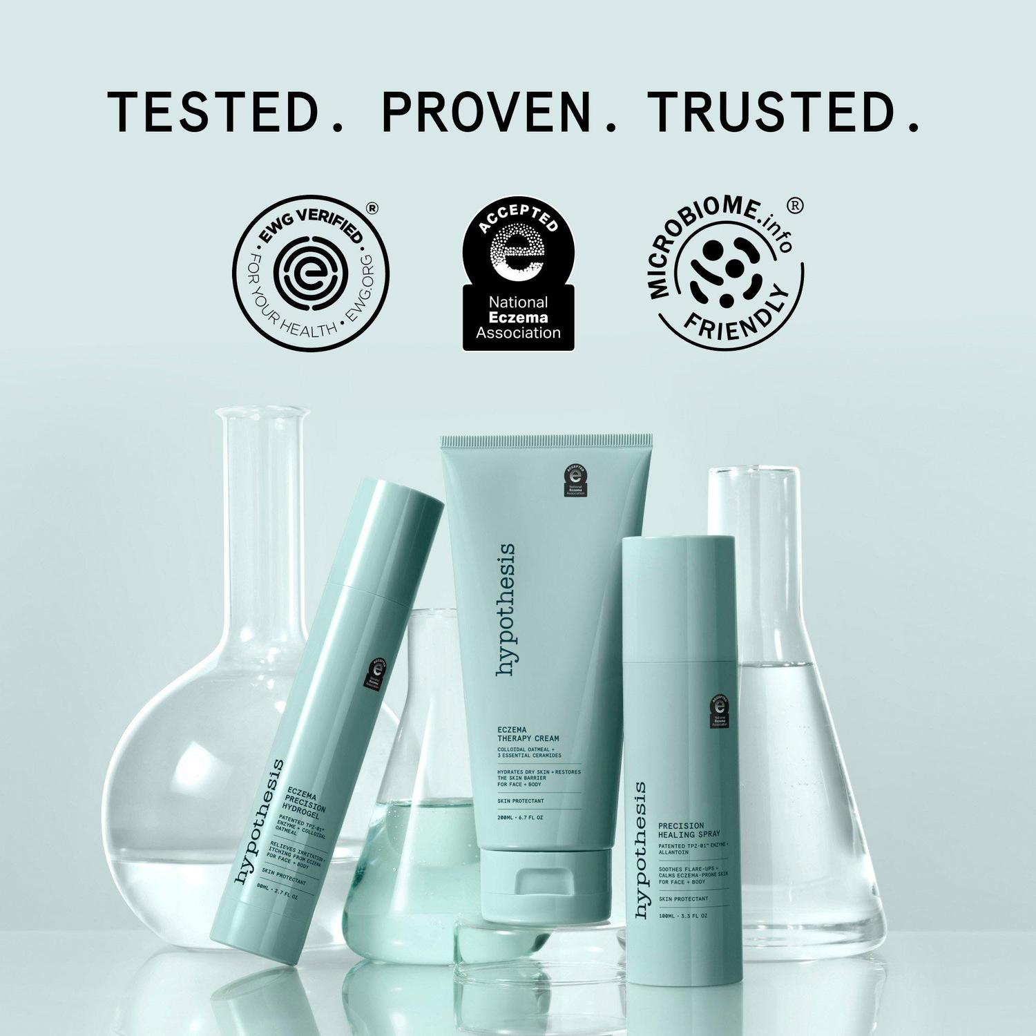- Разработано для работы в тандеме с запатентованным ферментом Hypothesis TPZ-01, содержащимся в гидрогеле Hypothesis Eczema Precision Hydrogel и заживляющем спрее Hypothesis Precision Healing Spray.
