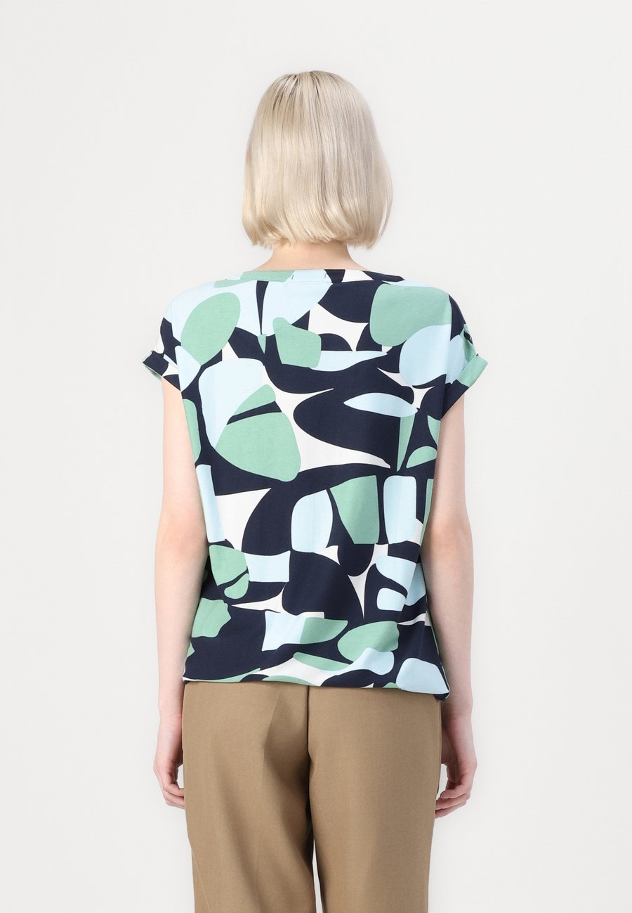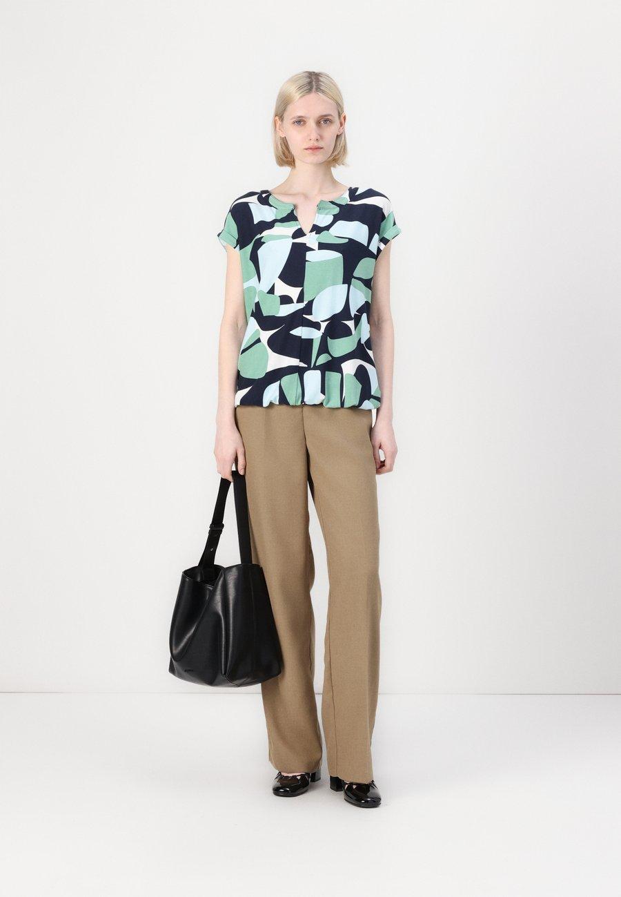 Футболка с узором, эластичным низом и фиксированными манжетами. Изготовлено из фактурного крепа. Вырез горловины: глубокий V-образный вырез.Материал и уход