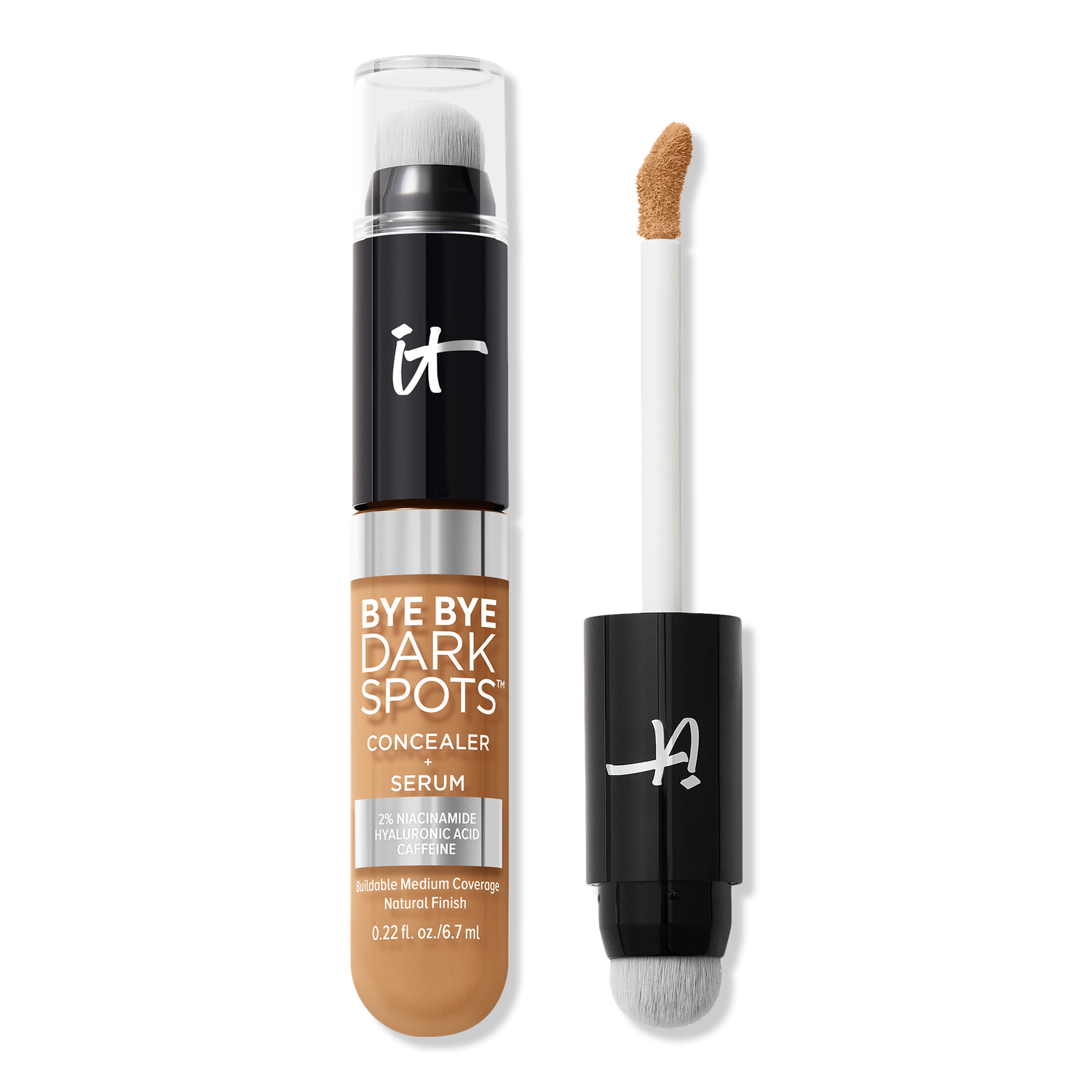 Консилер и сыворотка IT Cosmetics Bye Bye Dark Spots обеспечивают мгновенное покрытие средней степени и клинически эффективно осветляют темные пятна и другие проблемы кожи с течением времени.
