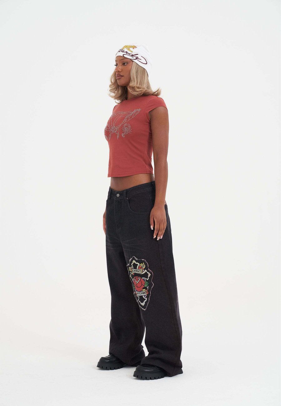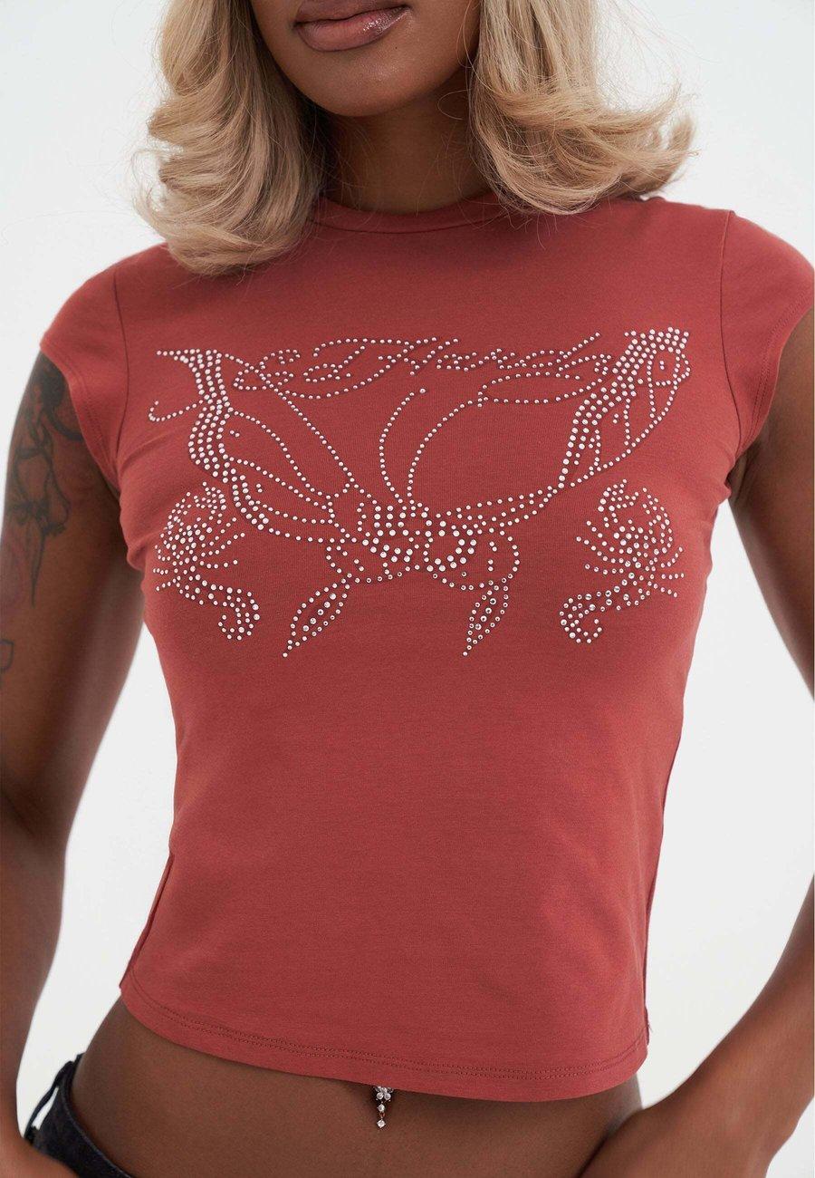Женская футболка с короткими рукавами и стразами, красная. Приталенный крой, полная длина, короткие рукава. Рисунок в виде татуировки бабочки и страз спереди. 95% хлопок, 5% спандекс, трикотаж 180 г. Наша модель (рост: 173 см, талия: 71 см) носит размер S. Вырез: круглый.Материал и уход