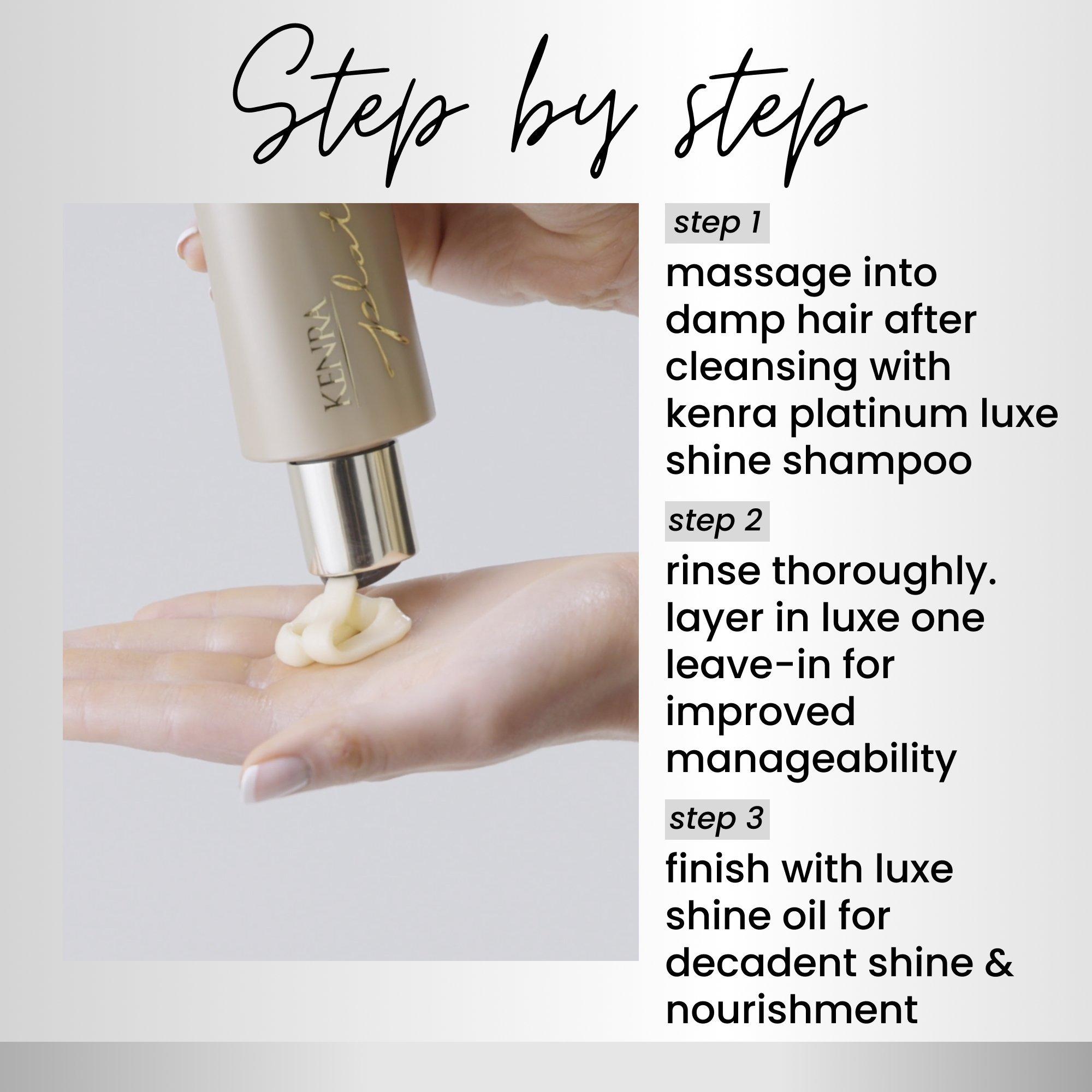 Нанесите массирующими движениями на влажные волосы после мытья шампунем Kenra Platinum Luxe Shine. Тщательно смойте. Завершите уход несмываемым кондиционером Luxe One.