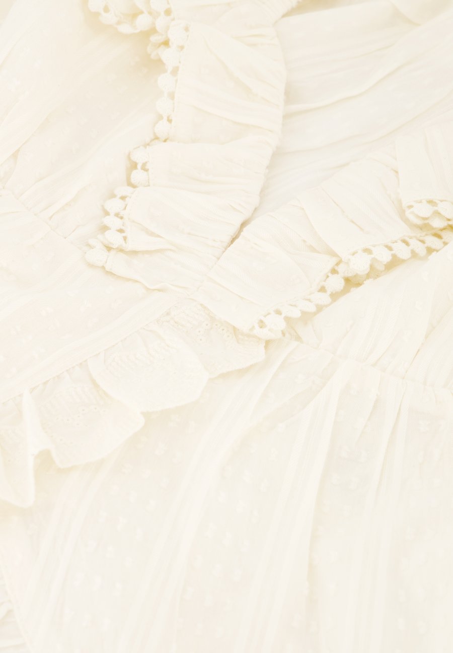 Этот белый топ, изготовленный из 100% хлопка, украшен игривыми оборками и изящными декоративными элементами спереди. Это идеальная летняя вещь, так как она легкая, воздушная и легко сочетается с другой одеждой. Вырез: Открытая спинаМатериал и уход