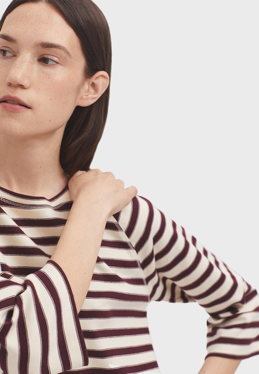 Эта футболка выполнена в современном стиле с полосатым узором в морском стиле и имеет рукава 3/4. Изготовлена из мягкого хлопкового трикотажа, имеет слегка свободный крой и рукава реглан, идеально подходящие для расслабленного, но в то же время элегантного образа. Переосмысленная базовая вещь, которую легко сочетать с повседневной одеждой. Сделано в Португалии. Вырез горловины: круглыйМатериал и уход