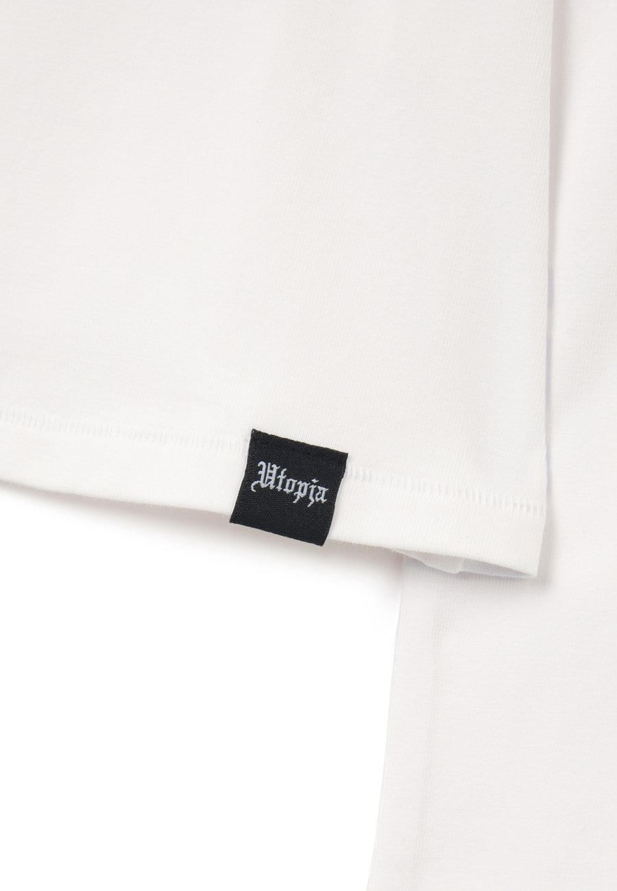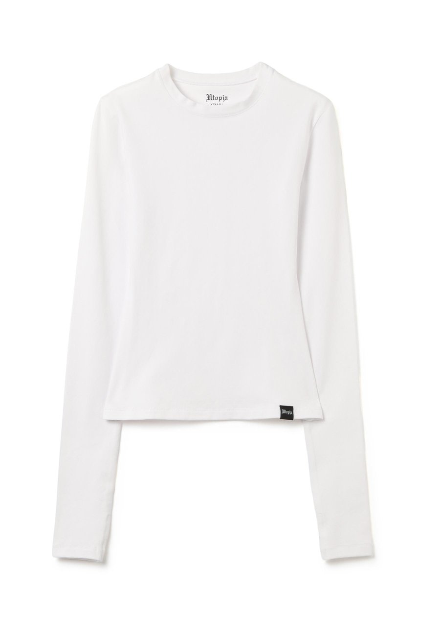 Белая футболка с длинными рукавами из эластичного хлопка от UTOPJA. Приталенный крой. Аккуратный круглый вырез. Манжеты с отверстиями для больших пальцев. Швы в тон и логотип Utopja сбоку. Вырез горловины: круглый.Материал и уход