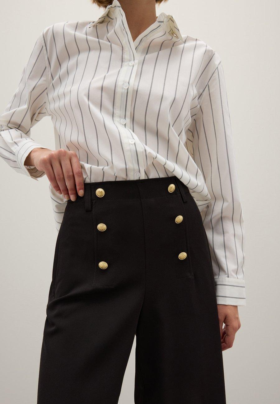 Расклешенные брюки линии PIOMBO обеспечивают комфорт и безупречную посадку благодаря структурированному поясу стандартного размера. Дизайн включает в себя двойной ряд золотых пуговиц, добавляющих изысканности вашему гардеробу. Идеально подходят как для формальных, так и для повседневных случаев, легко сочетаются с рубашками и блузками для создания завершенного образа. Посадка: НормальнаяМатериал и уход