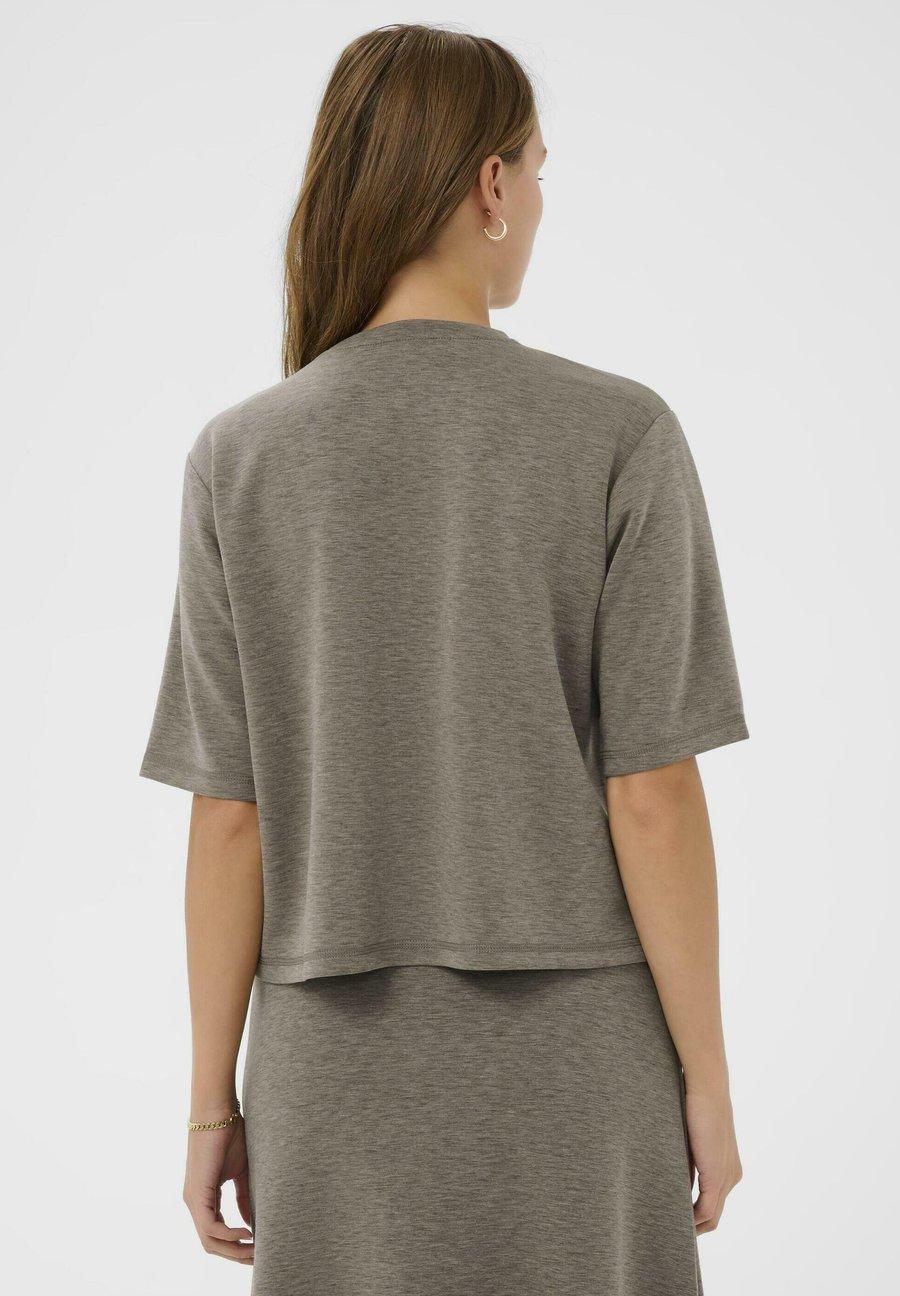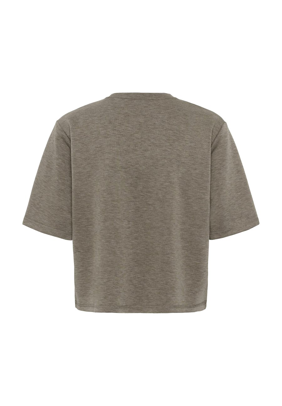 Футболка прямого кроя имеет слегка укороченную длину. Круглый вырез горловины и приспущенные плечи в сочетании с широкими рукавами до локтя. Мягкая ткань по всей поверхности. Аккуратно обработайте края рукавов и нижний край. Вырез горловины: круглый.Материал и уход