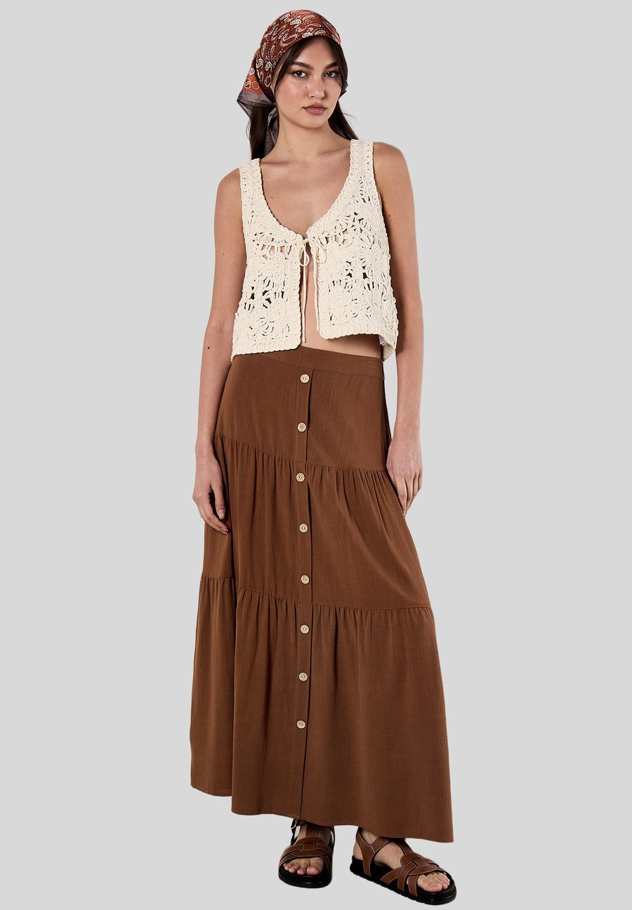 Эта юбка из льняной смеси, созданная для теплых дней, имеет ярусную структуру и лестную длину макси. Она оснащена эластичным поясом для идеальной посадки, а также декоративными кокосовыми пуговицами спереди. Носите ее с вязаным топом-жилетом и сандалиями для создания непринужденного богемного шика. Посадка: НормальнаяМатериал и уход