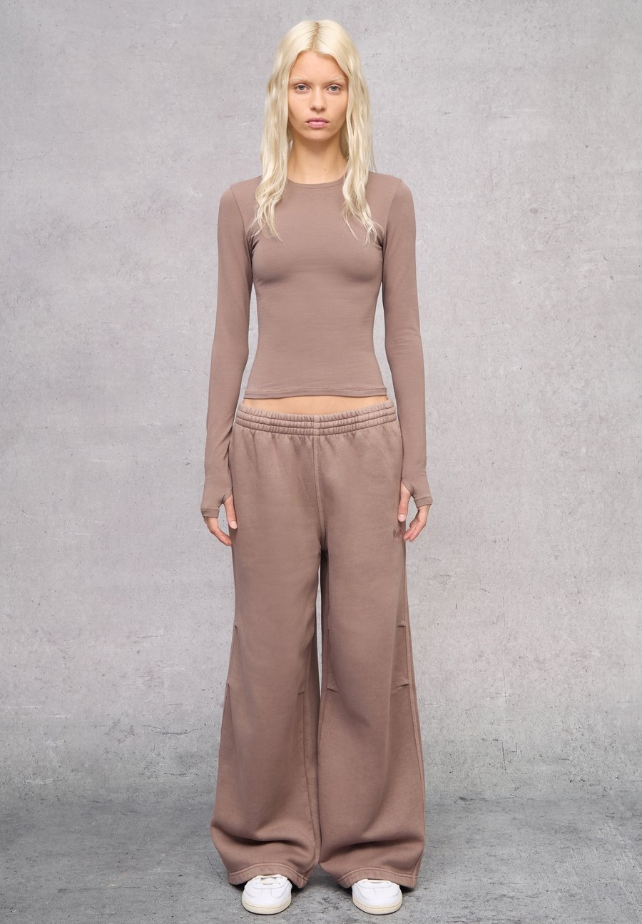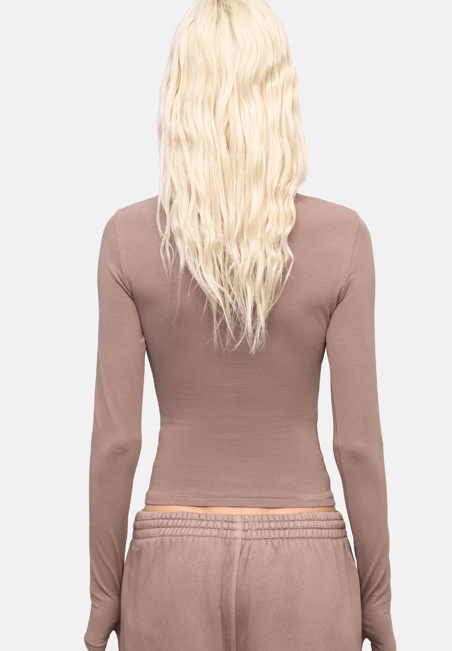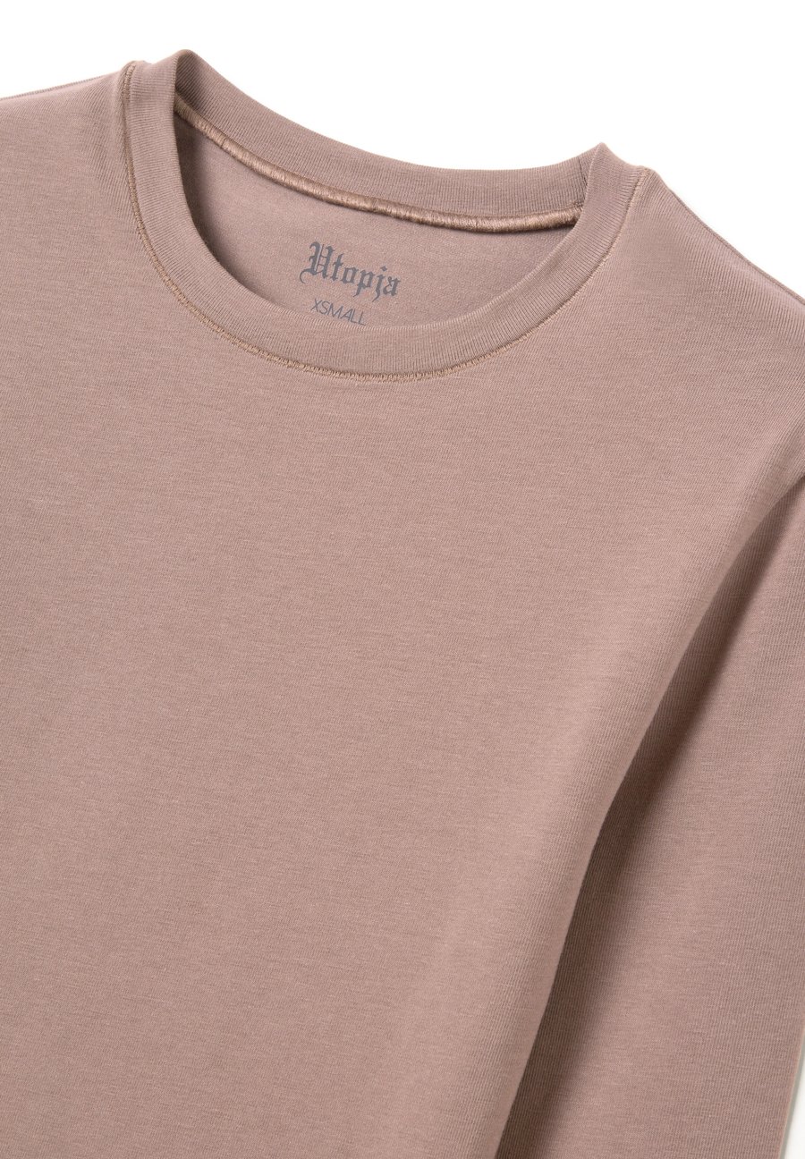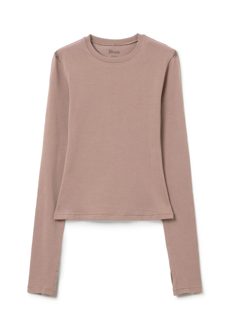Футболка с длинными рукавами цвета мокко из эластичного хлопка UTOPJA. Облегающий крой. Аккуратный круглый вырез горловины. Манжеты с отверстиями для больших пальцев. Контрастная строчка и логотип Utopja сбоку. Вырез горловины: круглый.Материал и уход