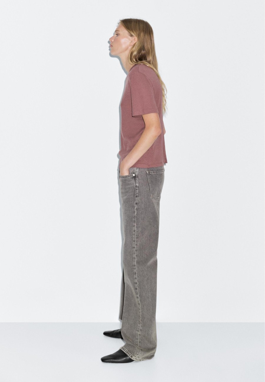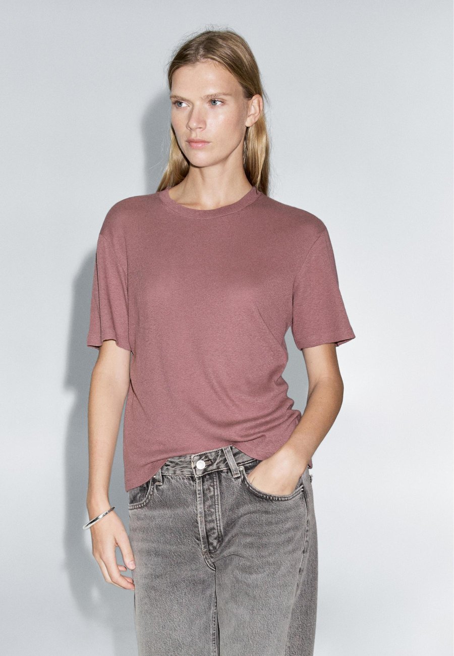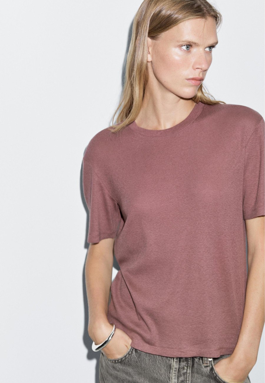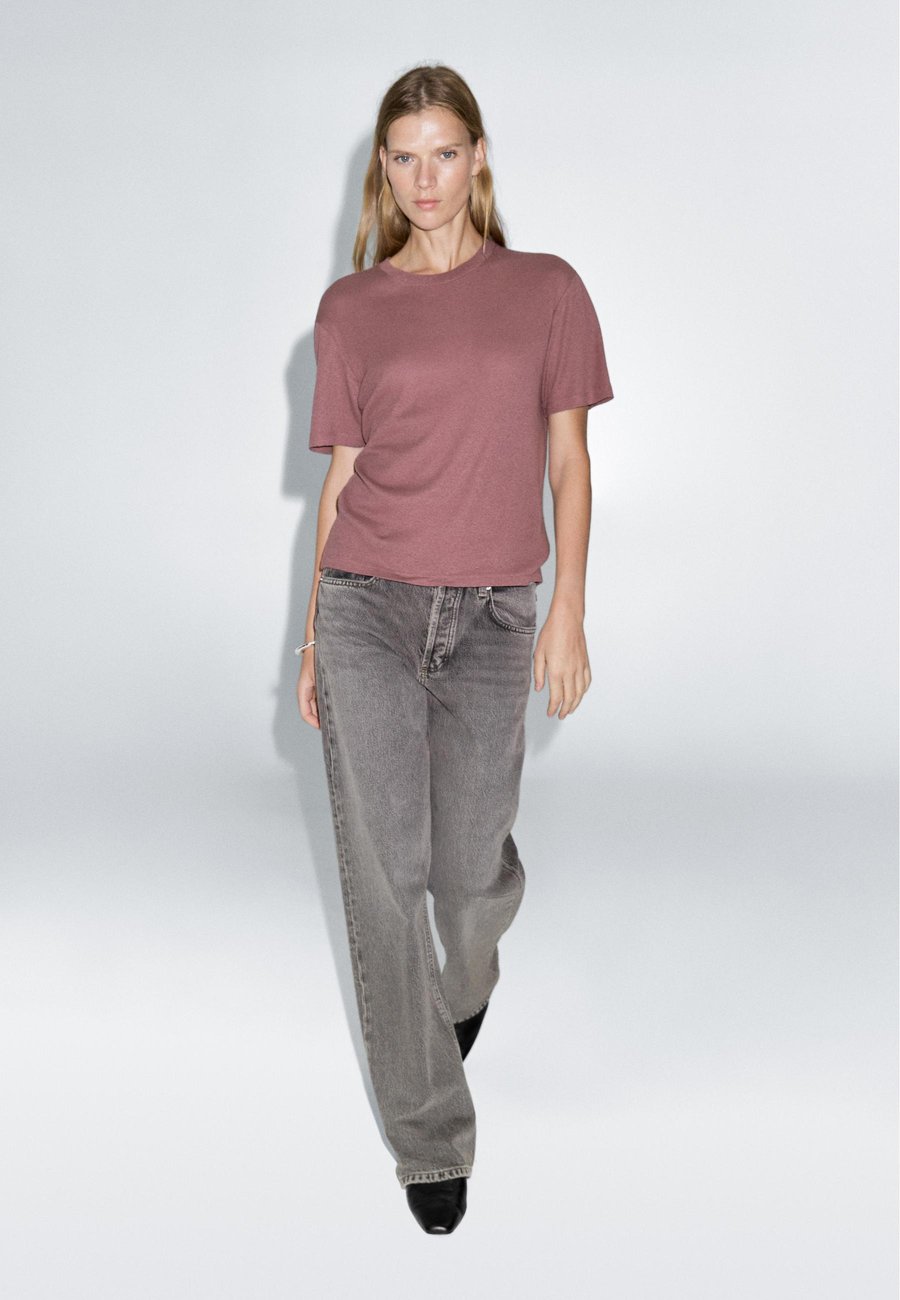 Широкий и свободный силуэт, не приталенный. Короткие рукава. Ребристая отделка. Круглый вырез. Футболка из смесовой хлопковой ткани. Вырез горловины: круглый.Материал и уход
