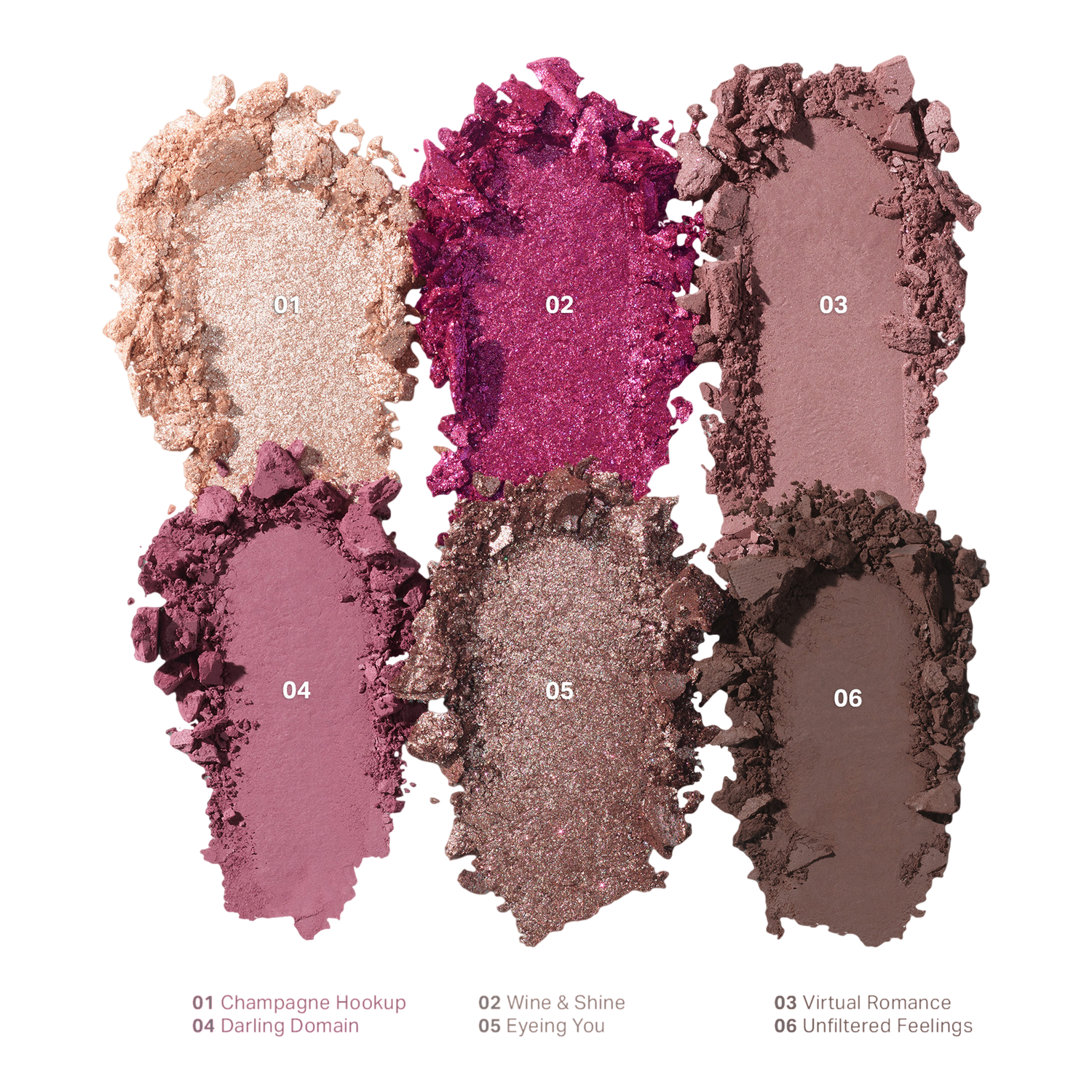- Верхний ряд: Champagne Hookup (мерцающий оттенок шампанского), Wine & Shine (игристый оттенок сангрии для влажного/сухого нанесения), Virtual Romance (матовый бледно-сливовый оттенок с розовыми перламутровыми частицами)