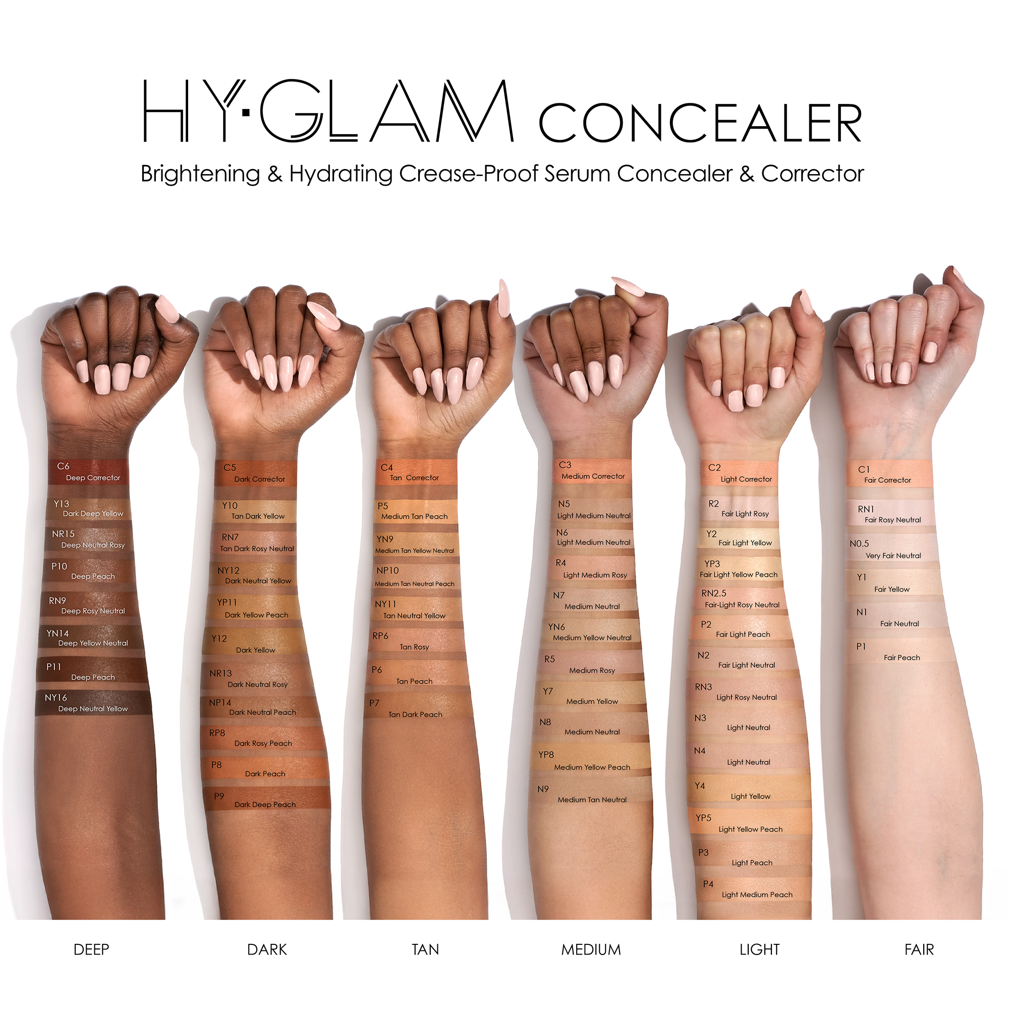 Найдите свой идеальный оттенок: подбор оттенка еще никогда не был таким простым. Линейка консилеров HY-GLAM включает 50 оттенков и 6 корректирующих оттенков. Благодаря системе подбора цвета, основанной на 6 овертонах (светлый, средний, загорелый, темный, глубокий) и 4 подтонах (нейтральный/холодный, желтый/золотистый/оливковый, персиковый/теплый, розовый/розовый), консилер идеально сливается с кожей, создавая естественный финиш, и держится до 19 часов.