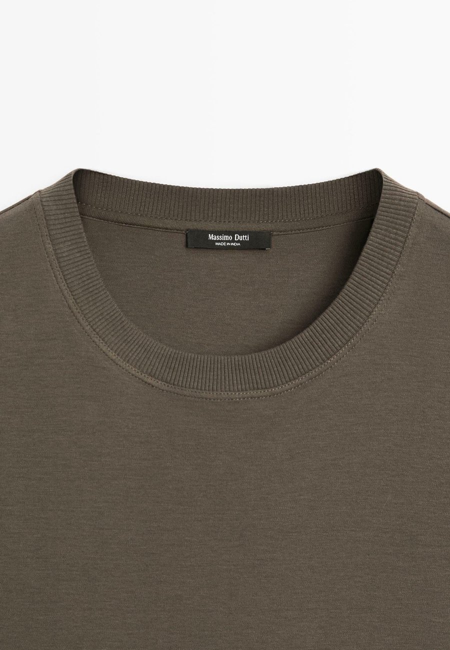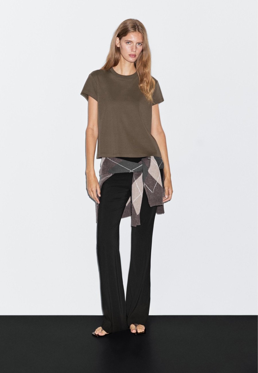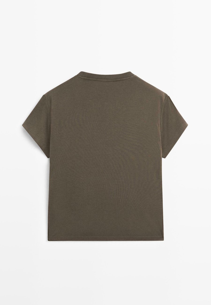 Широкий и свободный силуэт, не приталенный. Футболка из 100% хлопка. Короткие рукава. Ребристая отделка. Круглый вырез. Деталь воротника с контрастной отделкой. Вырез: круглый.Материал и уход