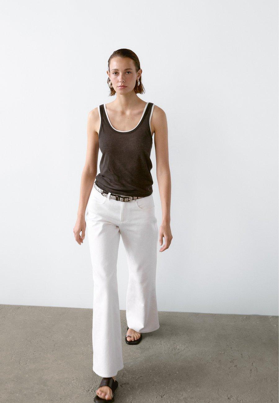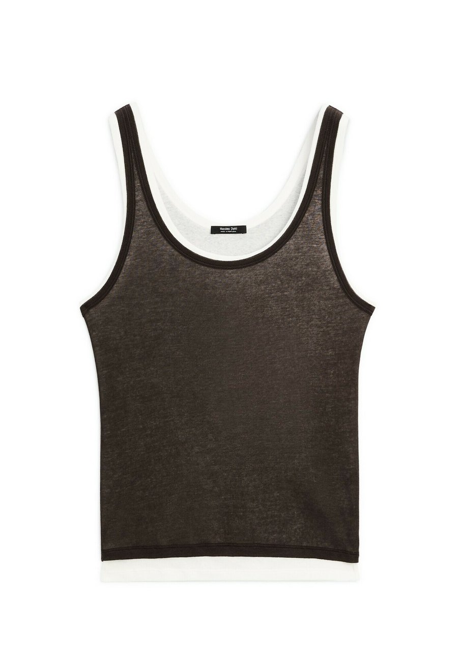 Футболка на бретелях. Круглый вырез. Изготовлена из 100% хлопка. Эффект потертости для легкого эффекта носки. Детали контрастного цвета. Изделие состоит из двух частей, соединенных небольшим швом по верхнему краю. Вырез горловины: Круглый.Материал и уход