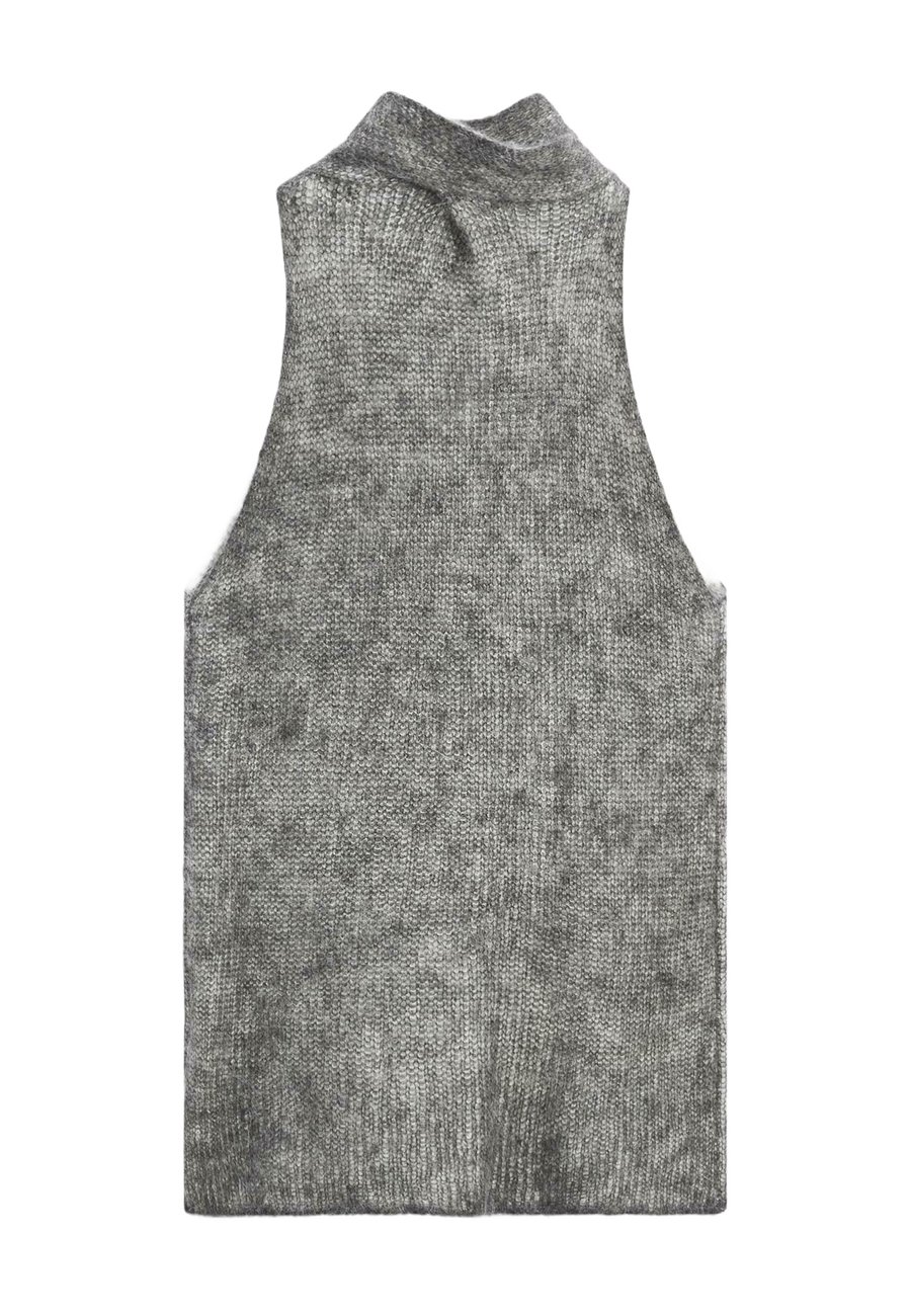 Топ изготовлен из трикотажной ткани, сочетающей шерсть и альпаку. Мягкая ткань, приятная на ощупь. Без рукавов. Воротник-стойкаМатериал и уход