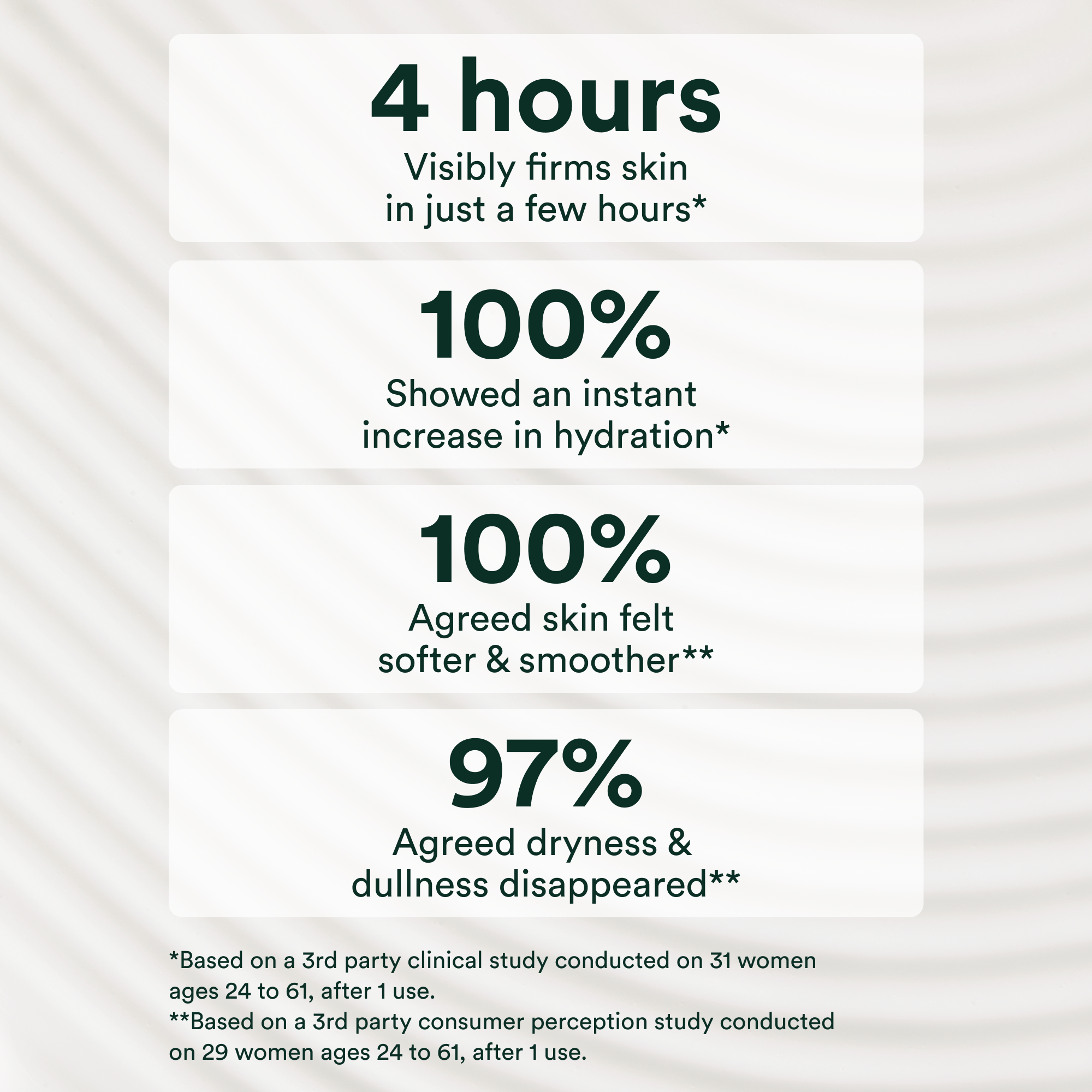 - Клинически доказано: заметно подтягивает кожу всего за 4 часа, мгновенно повышает увлажнение кожи и уменьшает видимую сухость на 86% и шероховатость на 83% сразу же*