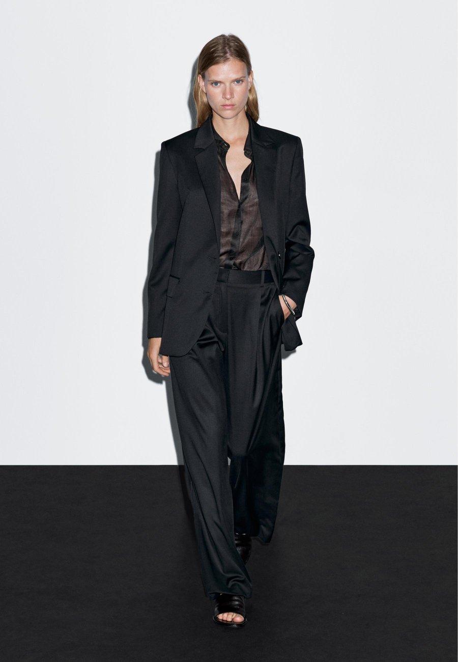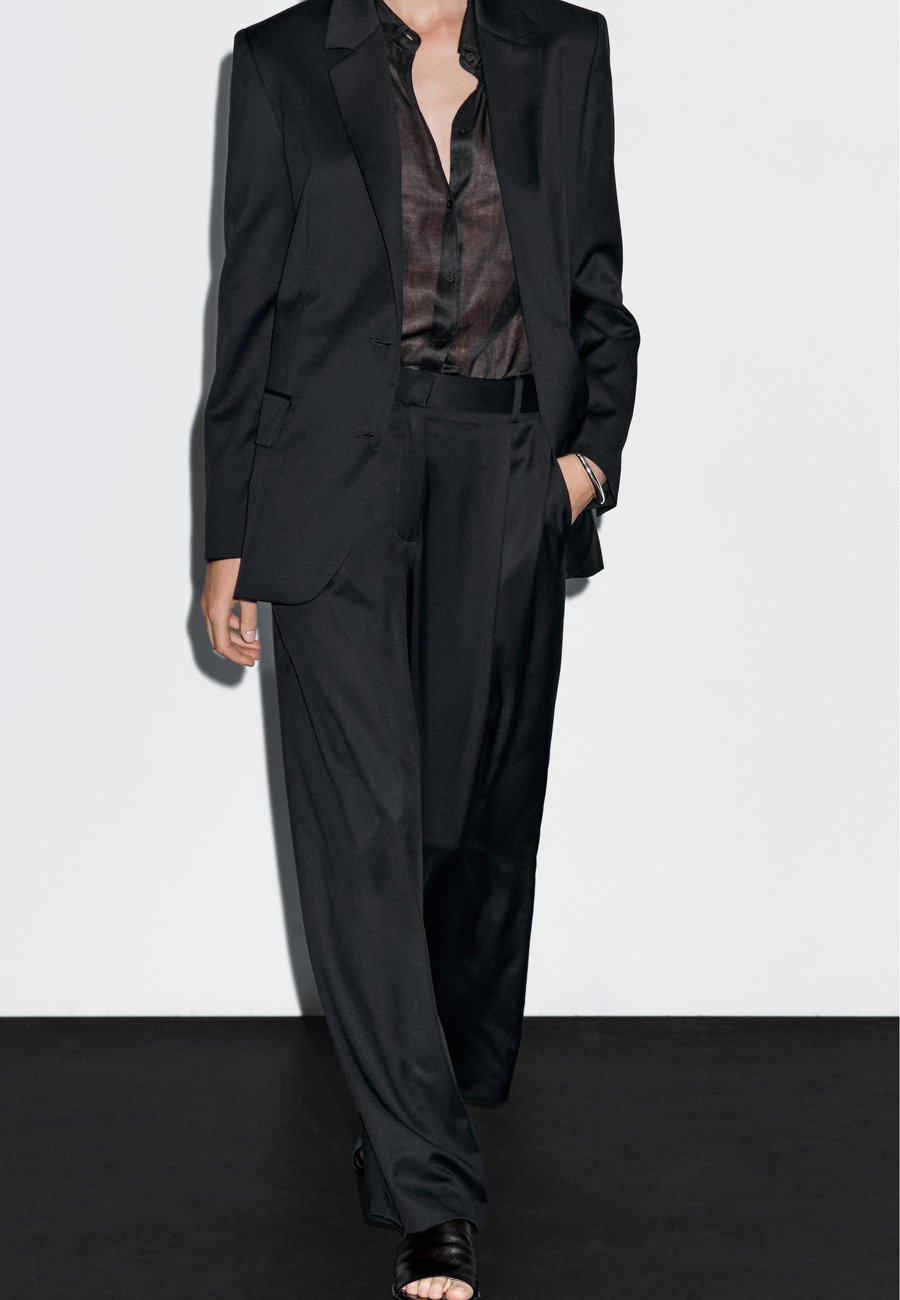 Застежка-молния, скрытая планкой, с крючком и петлей, а также пуговицей. Широкий и свободный силуэт, не приталенный. Два боковых кармана. Брюки из 100% шерстяной ткани. Этот предмет одежды является частью костюма. Один прорезной карман сзади. Двойная вытачка спереди. Посадка: НормальнаяМатериал и уход