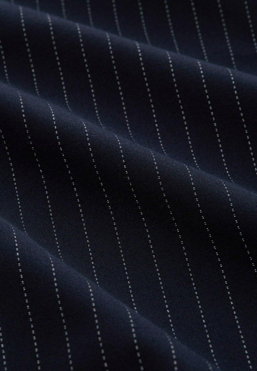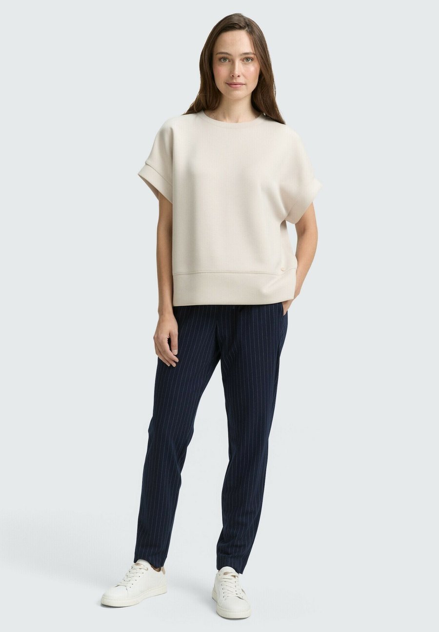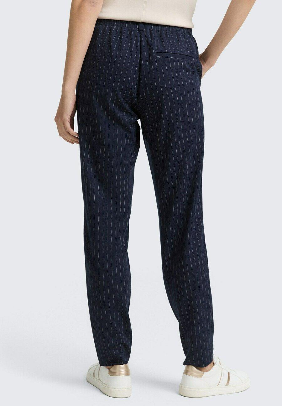 Свободный крой - средняя посадка на талии, свободные штанины, узкая штанина внизу. Свободные трикотажные брюки с эластичным поясом и шнурком. Брюки в тонкую полоску, с боковыми карманами спереди и имитацией кармана сзади. Пояс: регулируемыйМатериал и уход