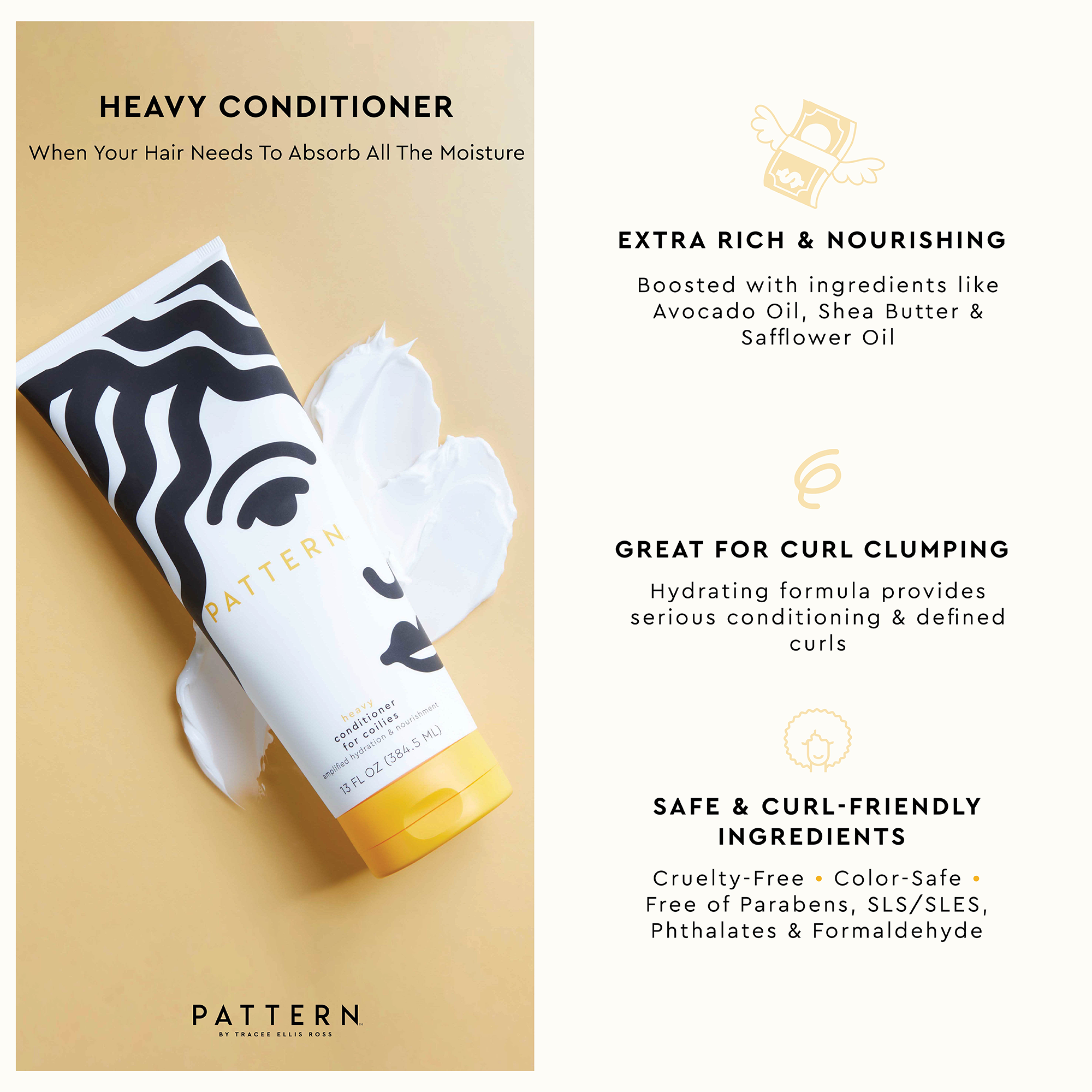 Нанесите на влажные волосы от корней до кончиков. Для очень густых локонов или длинных волос разделите волосы на пряди с помощью заколки PATTERN во время использования кондиционера, чтобы каждая прядь получила необходимый уход. Используйте щетку для душа PATTERN или пальцы, чтобы распутать волосы и собрать локоны. Совет профессионала: Для сухих или ломких волос оставьте кондиционер на 10 минут в качестве увлажняющей маски, чтобы восстановить и оживить ваши локоны.