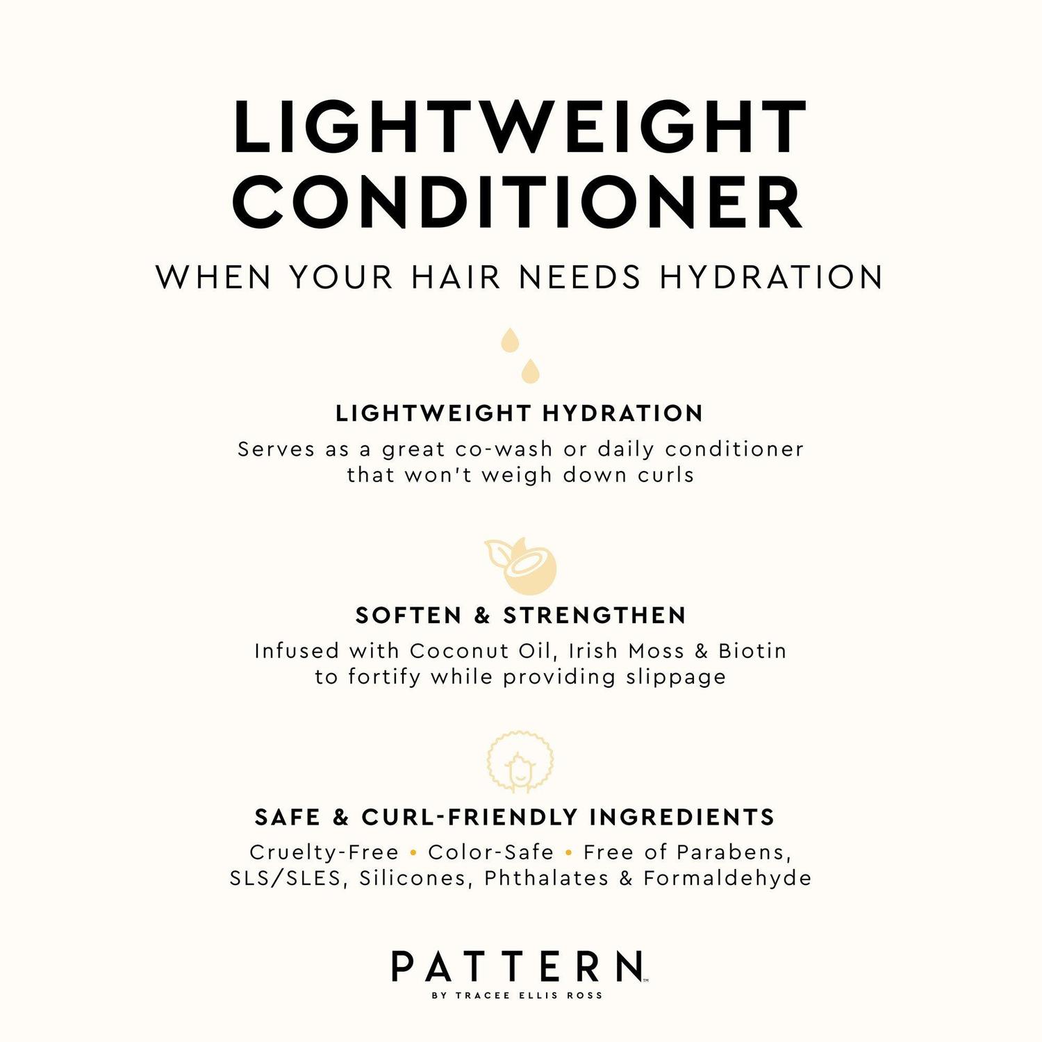 Способ применения Нанесите на влажные волосы от корней до кончиков. Для очень густых локонов или длинных волос разделите их на пряди с помощью заколки PATTERN во время использования кондиционера, чтобы каждая прядь получила необходимый уход. Используйте с щеткой для душа PATTERN или пальцами, чтобы распутать волосы и собрать локоны.