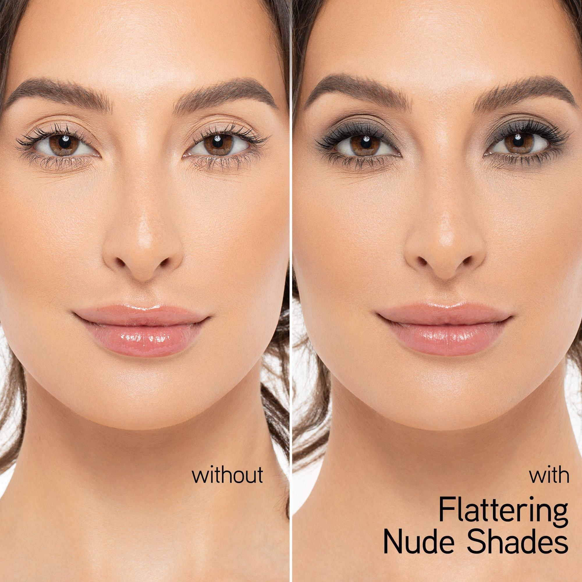Нанесите и растушуйте тени, используя более светлый оттенок вдоль надбровной дуги и во внутреннем уголке глаза, средние оттенки - у основания века, а более темные - в складке века и по внешнему краю века.Ингредиенты