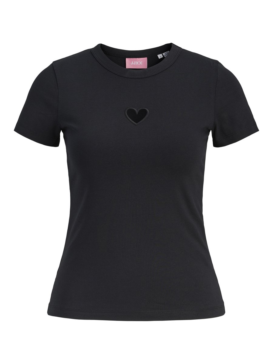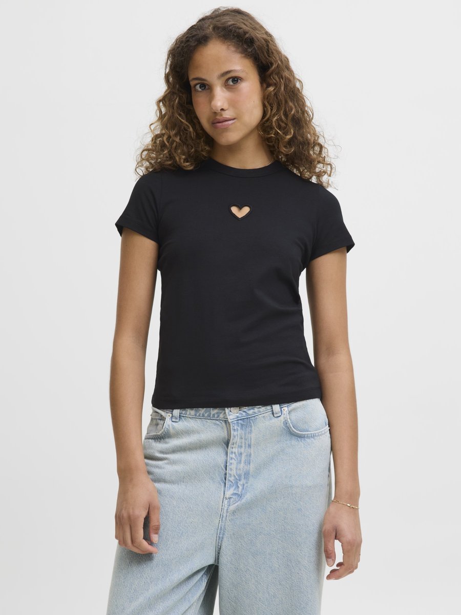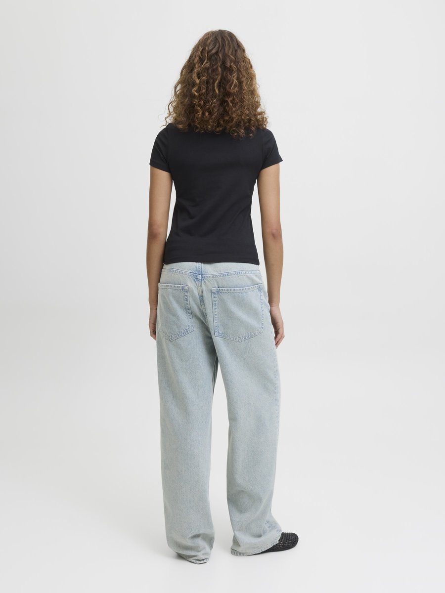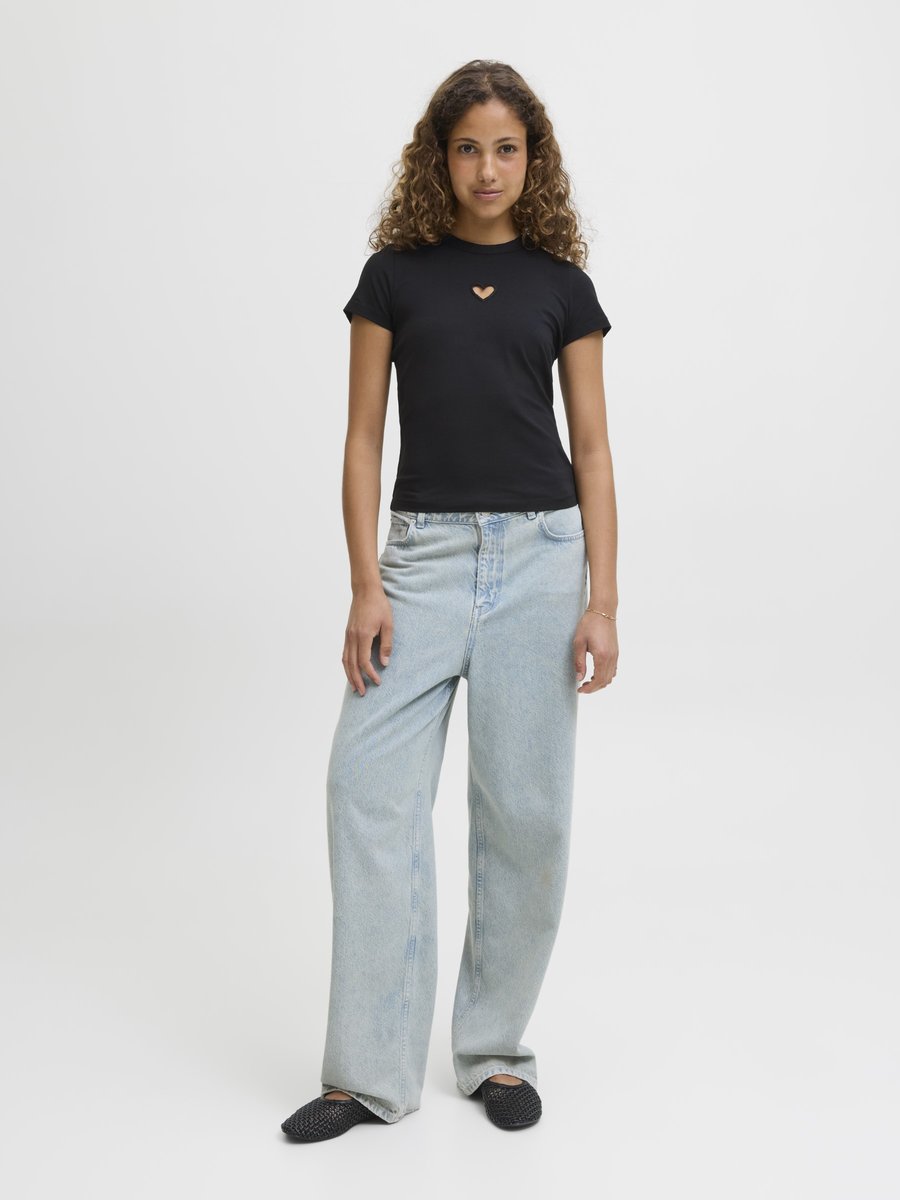 Детали выреза. Небольшая этикетка-флажок на уровне груди. Вырез горловины: круглый.Материал и уход