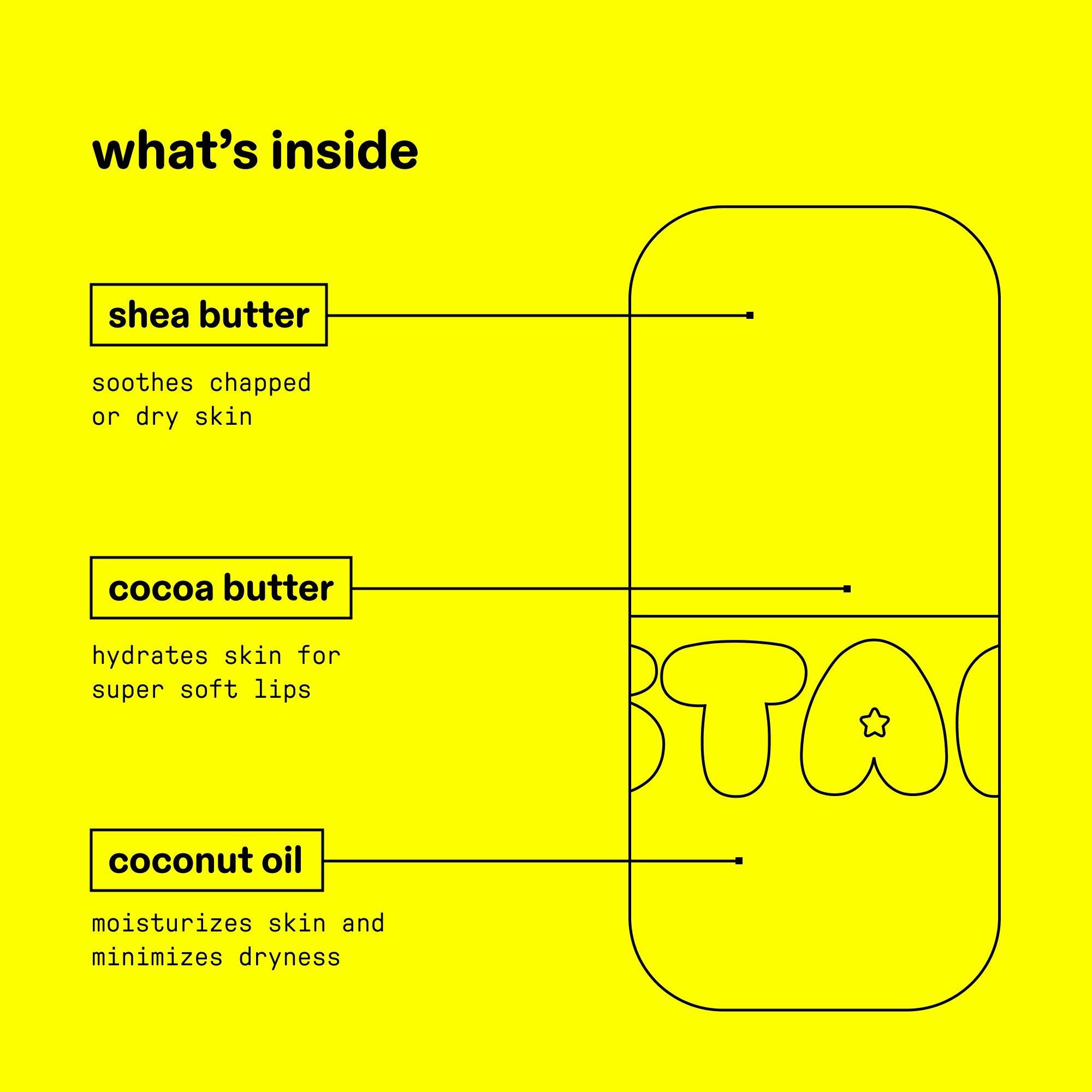 Нанесите бальзам Star Balm, чтобы успокоить и увлажнить губы. Когда бальзам закончится, промойте контейнер и сдайте его на переработку или используйте повторно.Ингредиенты